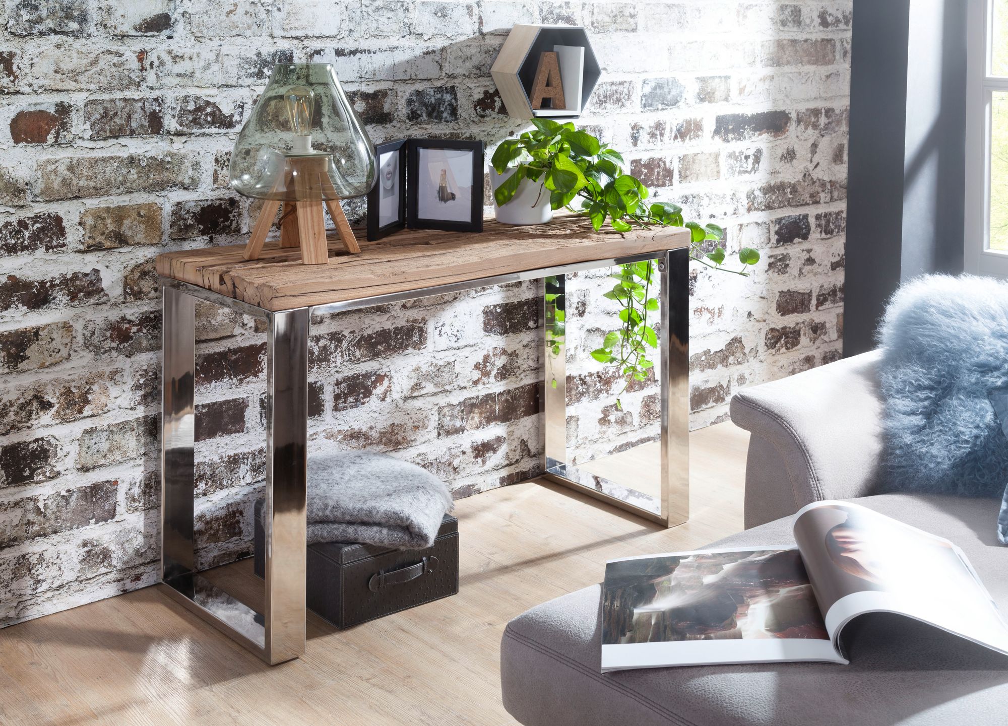 Esta consola de madera maciza de acacia natural destaca por su moderno estilo industrial y estabilidad. La amplia superficie rectangular se apoya sobre patas de acero cromado en forma de trineo, garantizando firmeza y diseño.