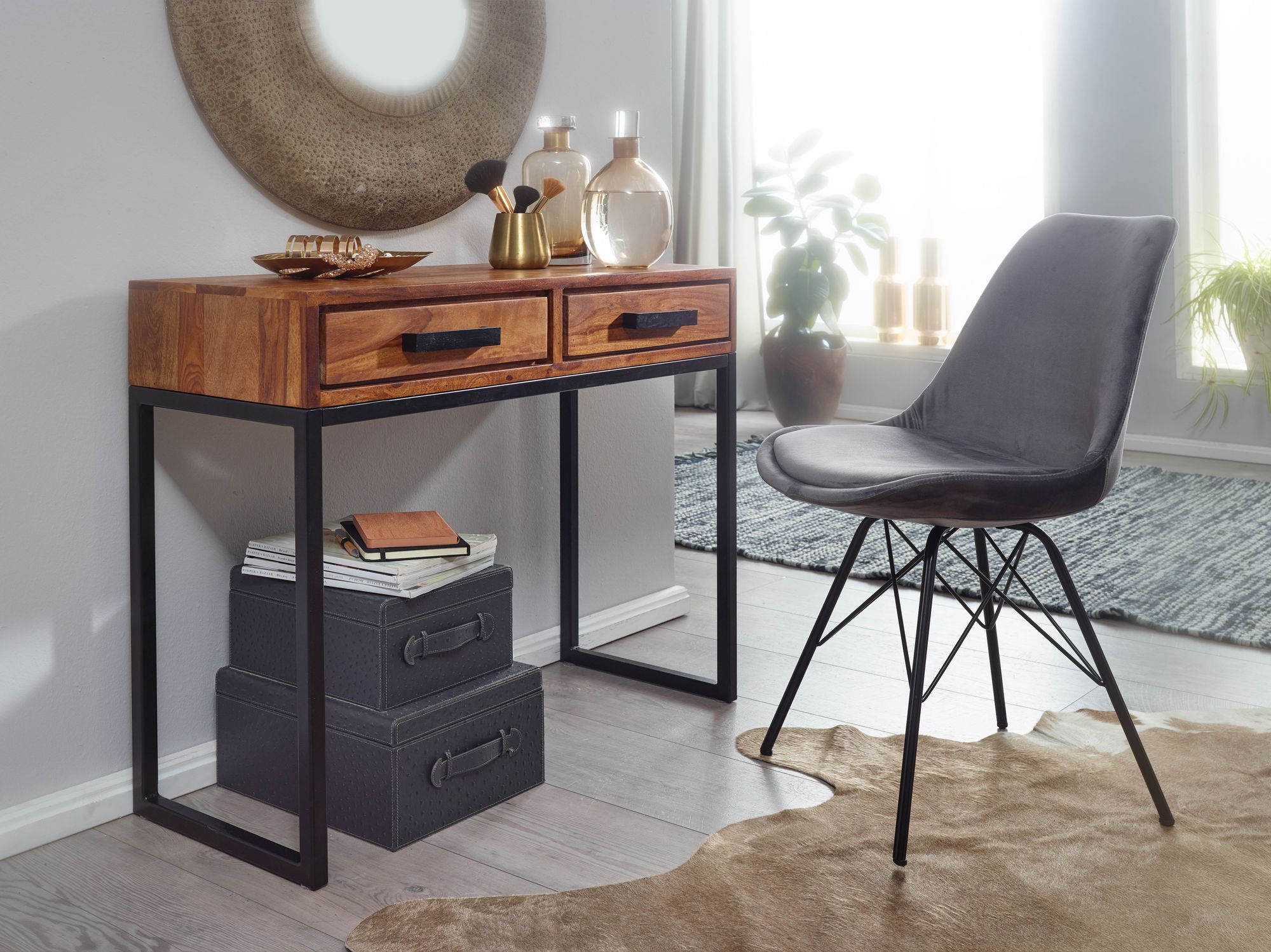 Añada un toque elegante e industrial a su hogar con esta consola de madera maciza de Sheesham y estructura metálica negra. Compacta y funcional, cuenta con dos cajones espaciosos con guías completas y topes giratorios para organizar sus objetos en el recibidor o salón.