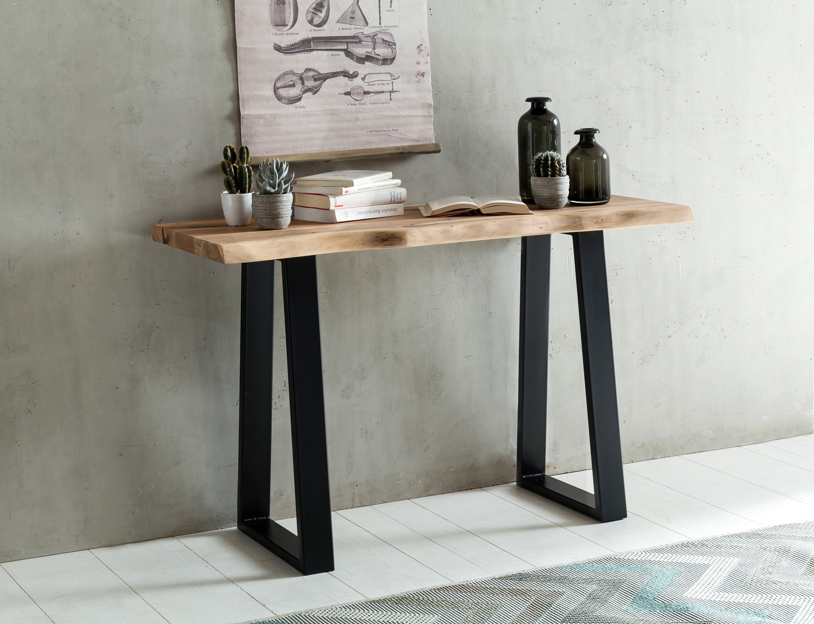 La consola GAYA de madera maciza de acacia combina encanto natural y durabilidad, ideal para espacios pequeños. Sus medidas compactas de 120 x 45 cm y altura de 75 cm hacen que sea versátil para usar como consola, escritorio o tocador. Las resistentes patas metálicas negras en forma triangular aportan estabilidad y un estilo moderno.
