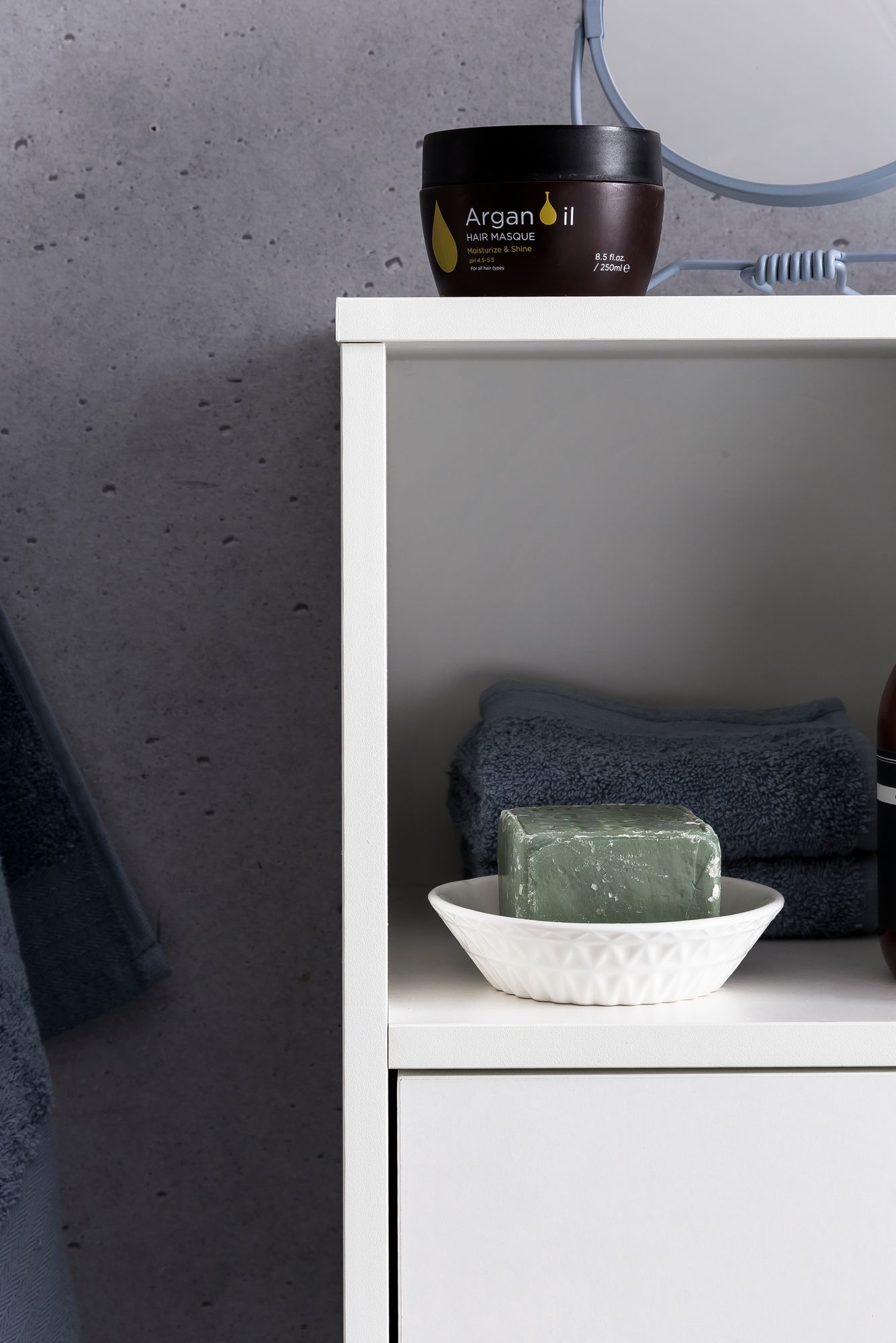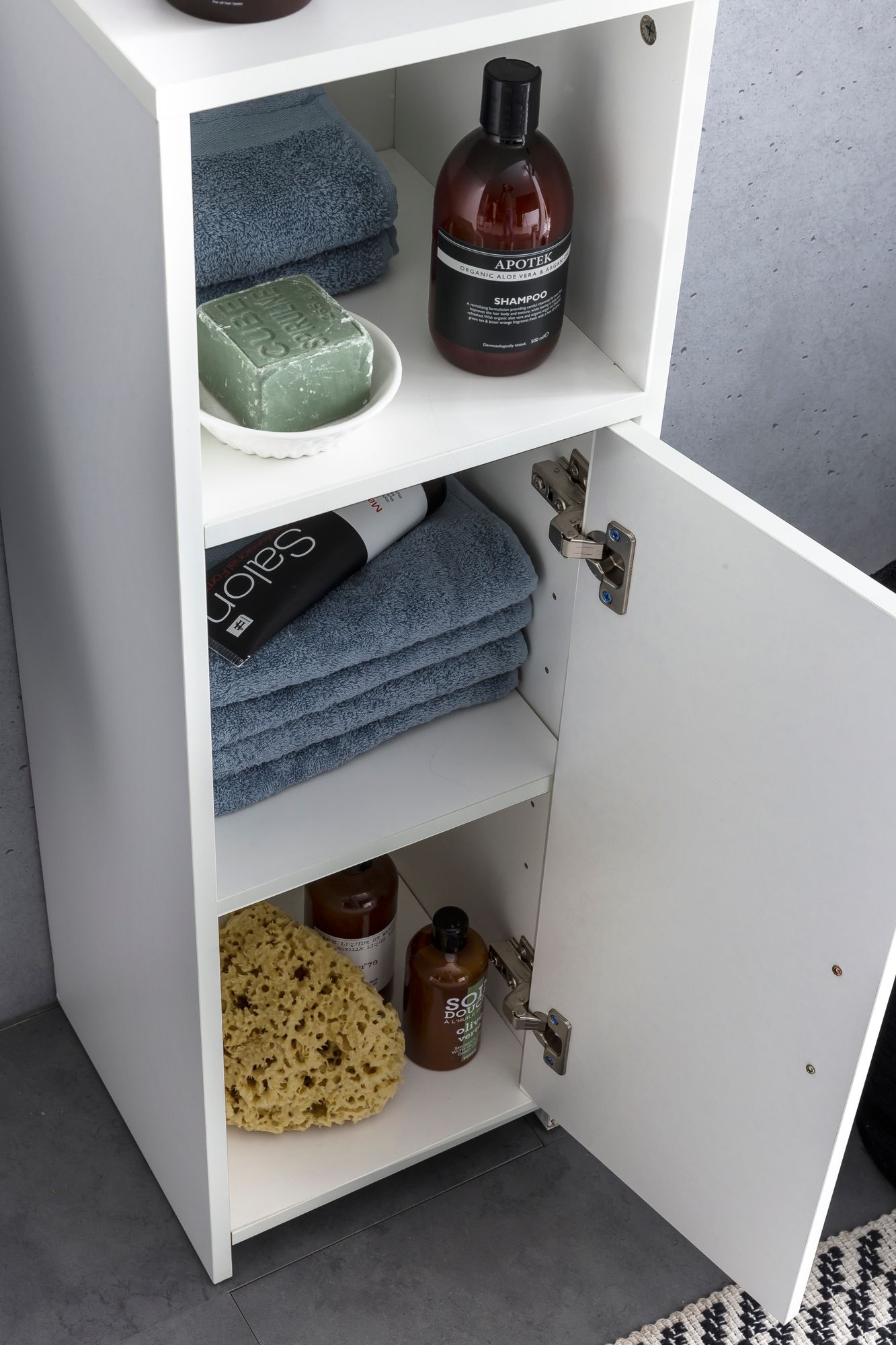 Este armario de baño blanco de madera presenta un diseño moderno y atemporal ideal para espacios pequeños. Incluye una puerta y un compartimento estante para opciones de almacenamiento versátiles.