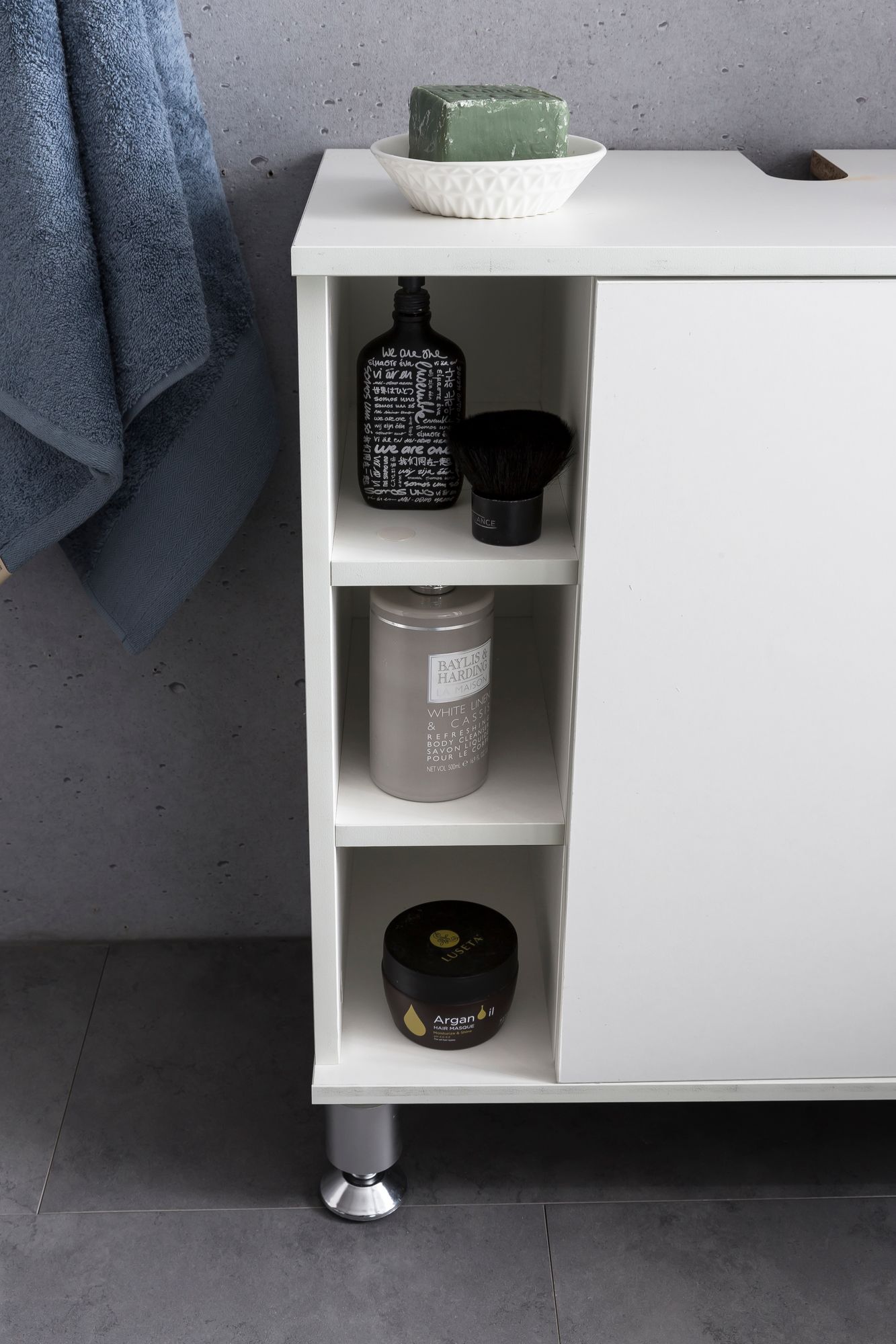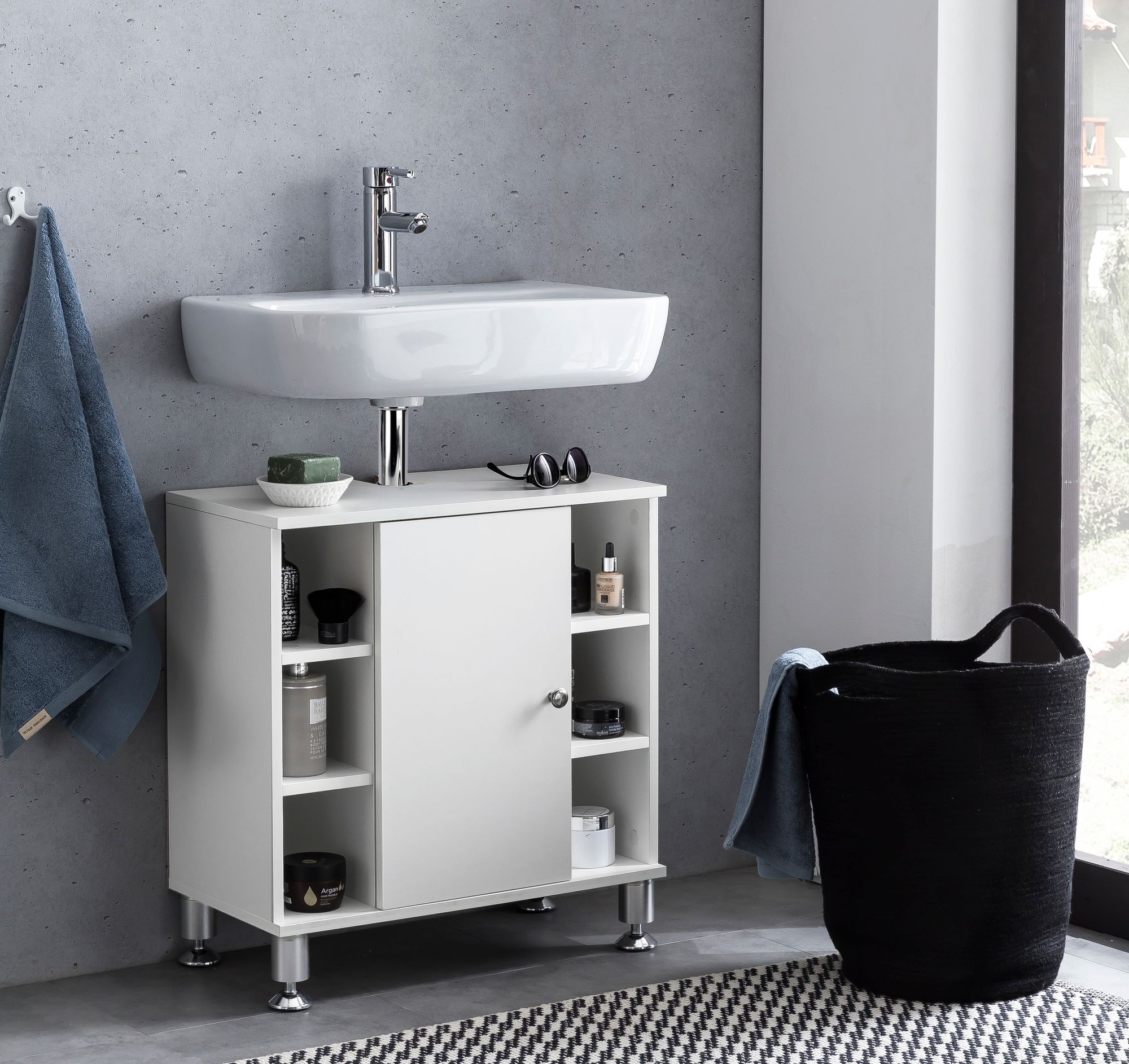 Las elegantes patas con acabado aluminio son regulables en altura, asegurando estabilidad. La abertura para sifón es compatible con lavabos estándar.
