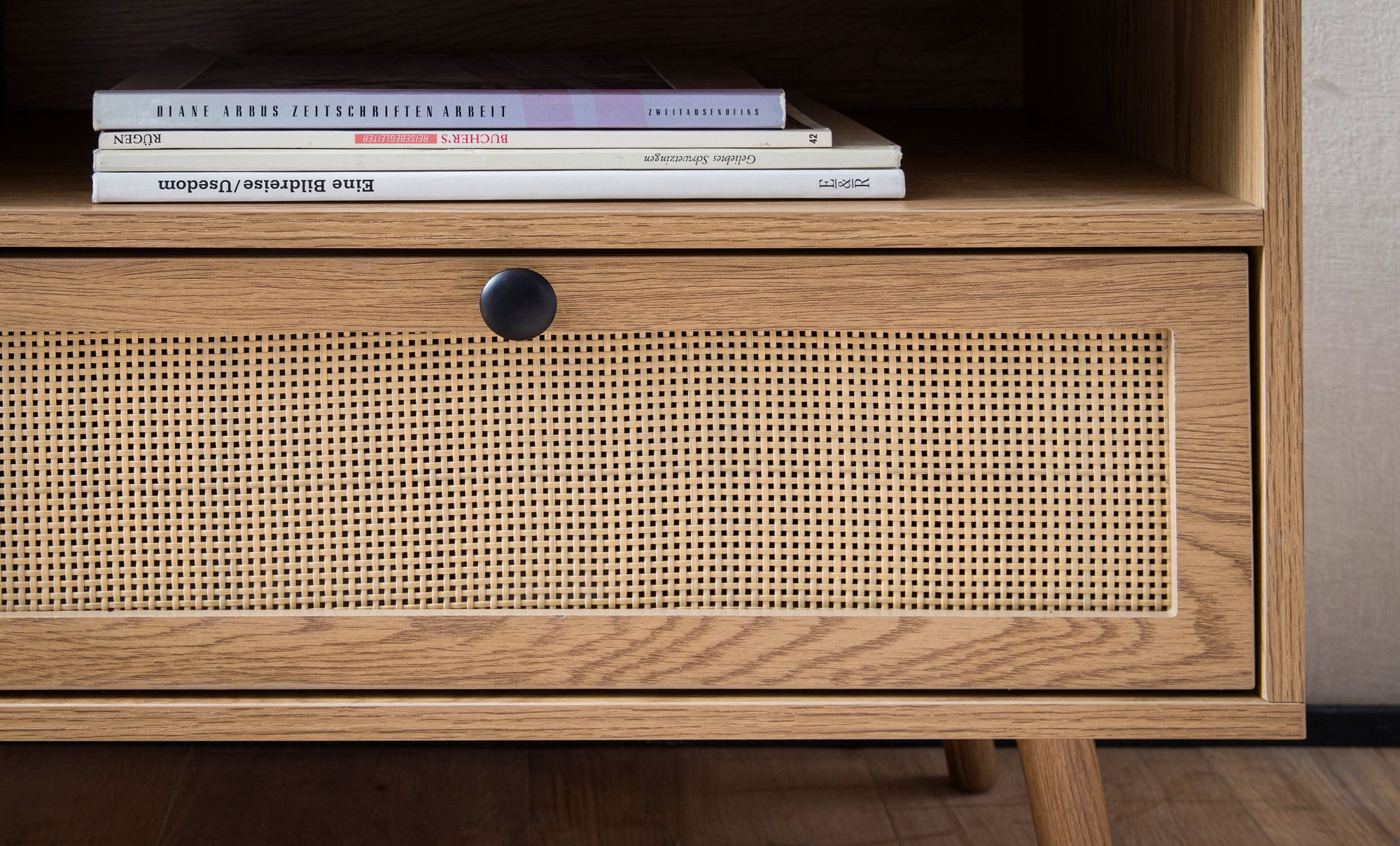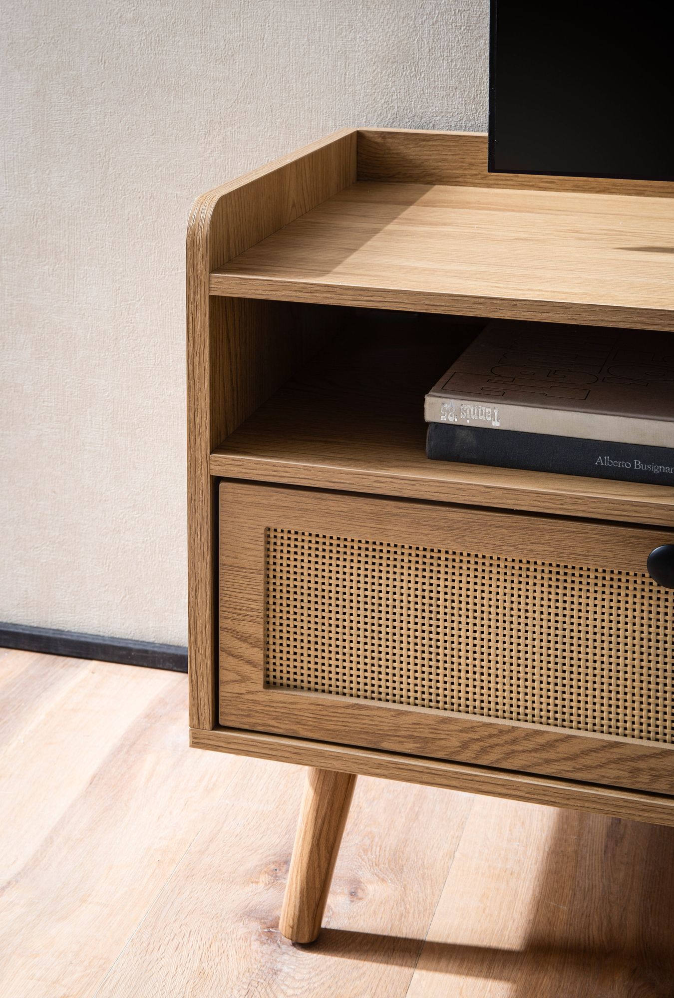 Lowboard moderno de 120x56x39 cm con decoración en roble y detalles de ratán elegante. La superficie rectangular ofrece amplio espacio para su televisor, mientras que los dos cajones con frentes trenzados permiten guardar consolas y DVDs discretamente.