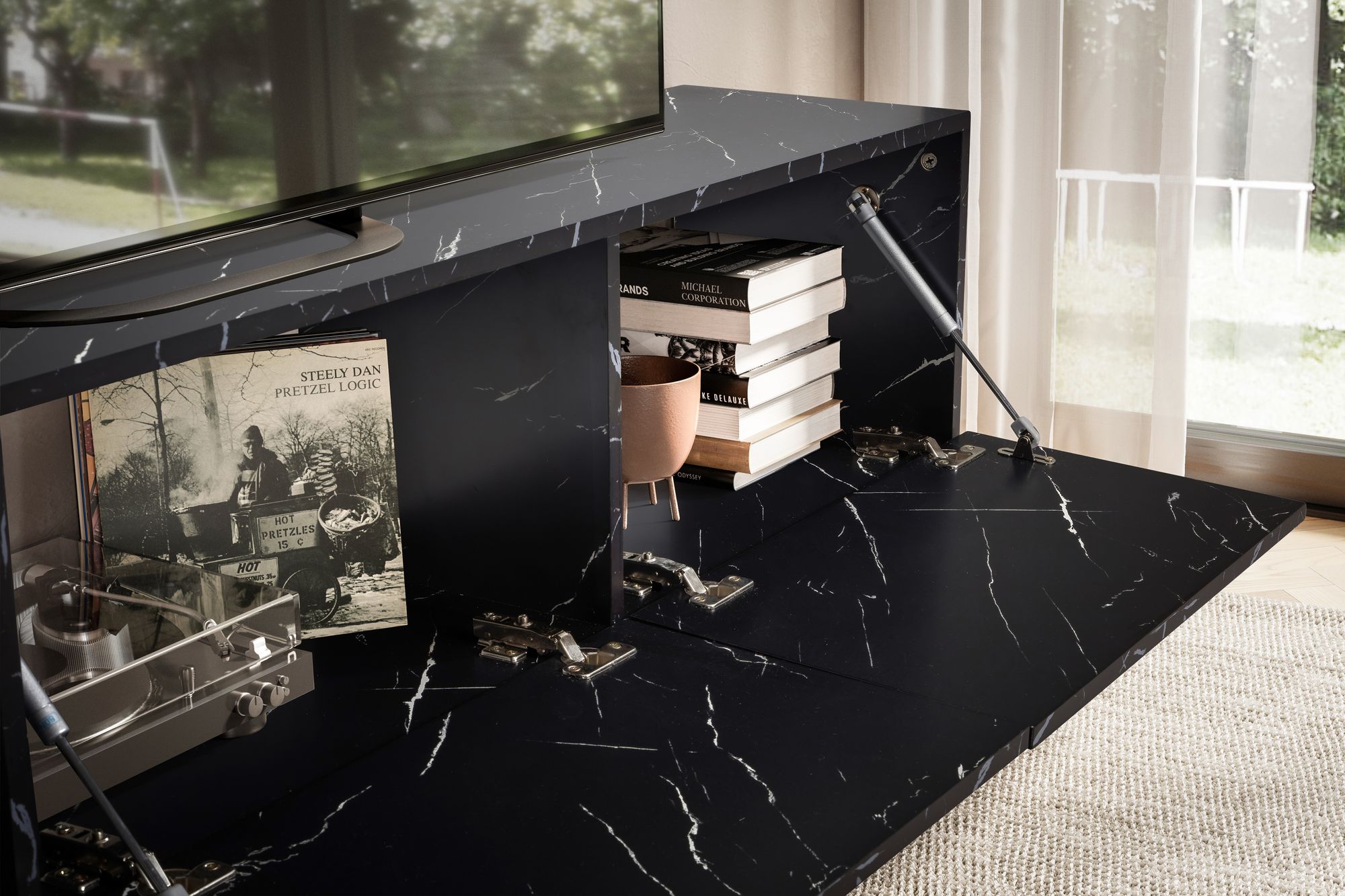 - Puertas abatibles para almacenar discretamente DVDs y consolas