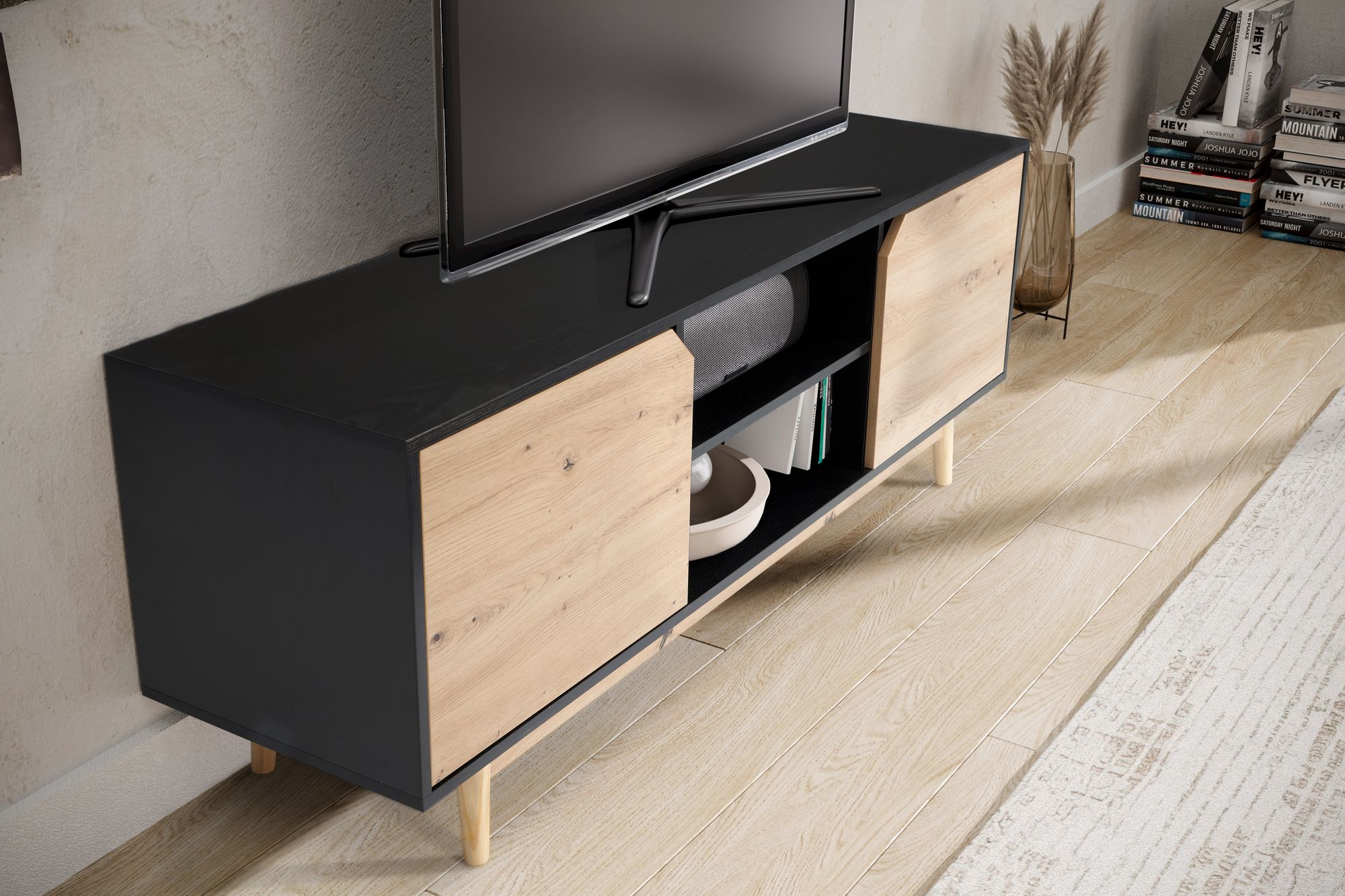 Este moderno lowboard negro con decoración en roble de 150x55x40 cm encaja elegantemente en su sala. Proporciona una superficie espaciosa para televisores de hasta 70 pulgadas y almacenamiento optimizado.