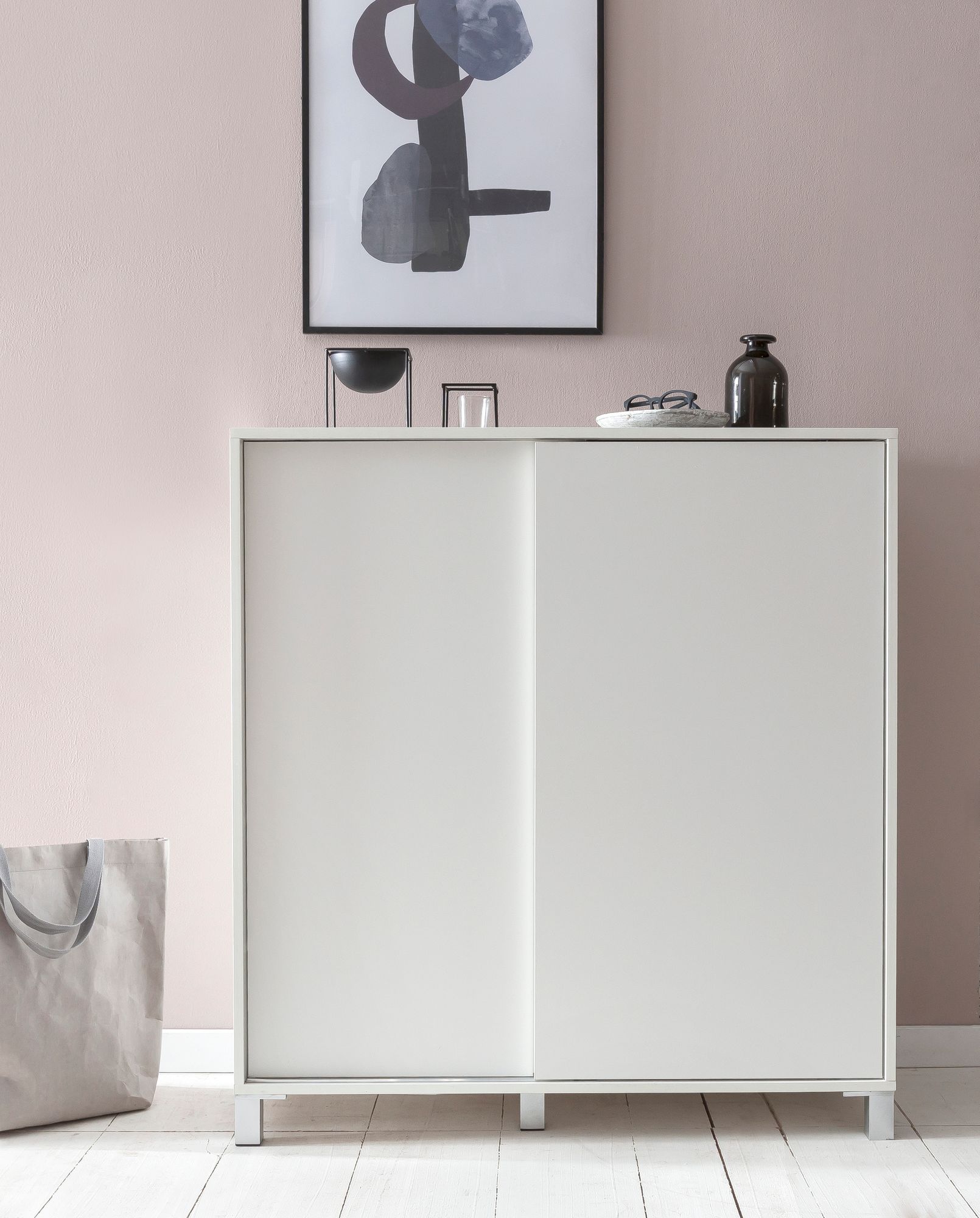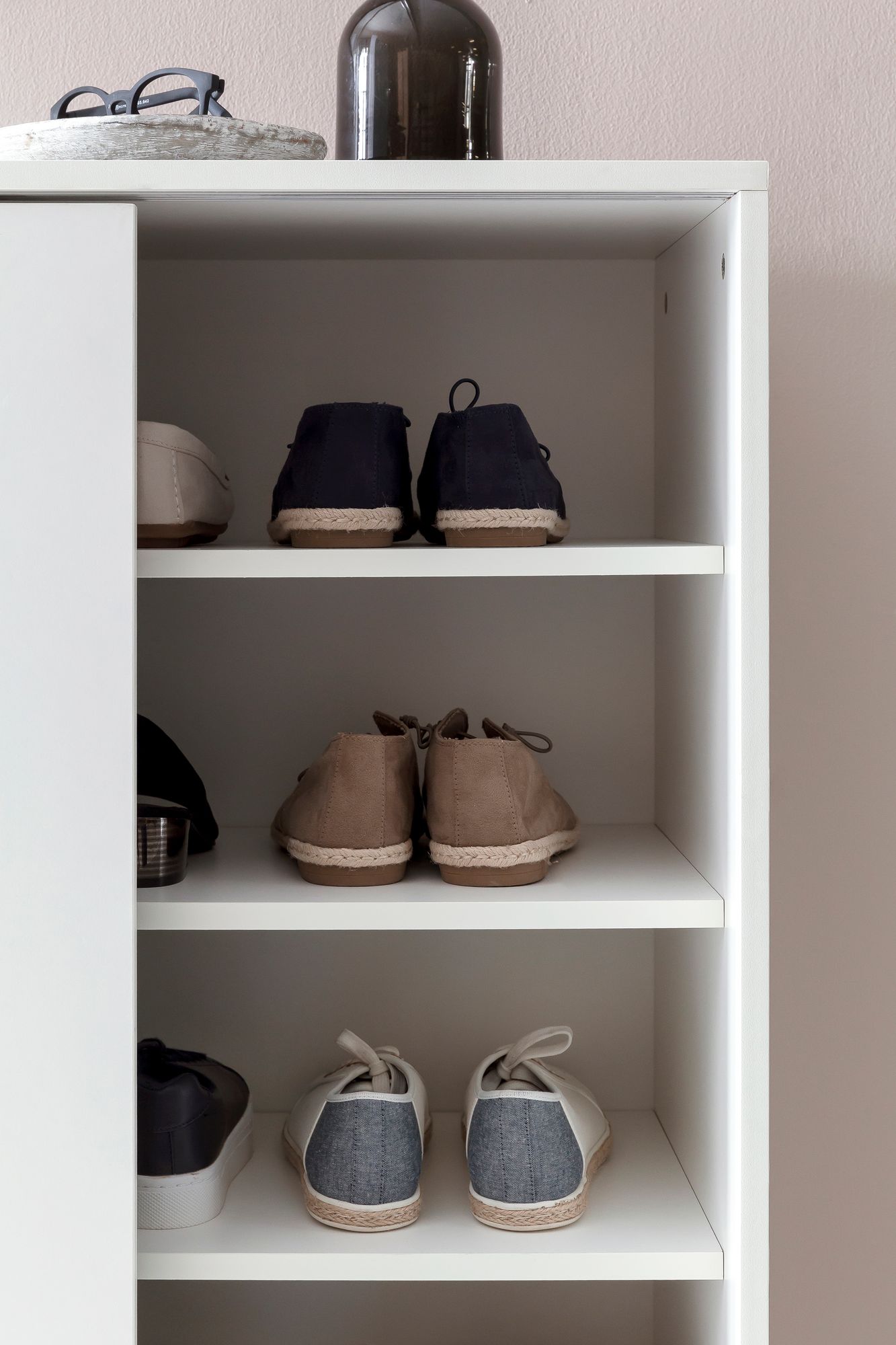 Este armario para zapatos blanco y moderno cuenta con cinco estantes extraíbles que ofrecen espacio para aproximadamente 20 pares de zapatos, tomando como referencia la talla 42. Protege las paredes con un panel trasero sólido y cuenta con patas antideslizantes para evitar rayones en el suelo.
