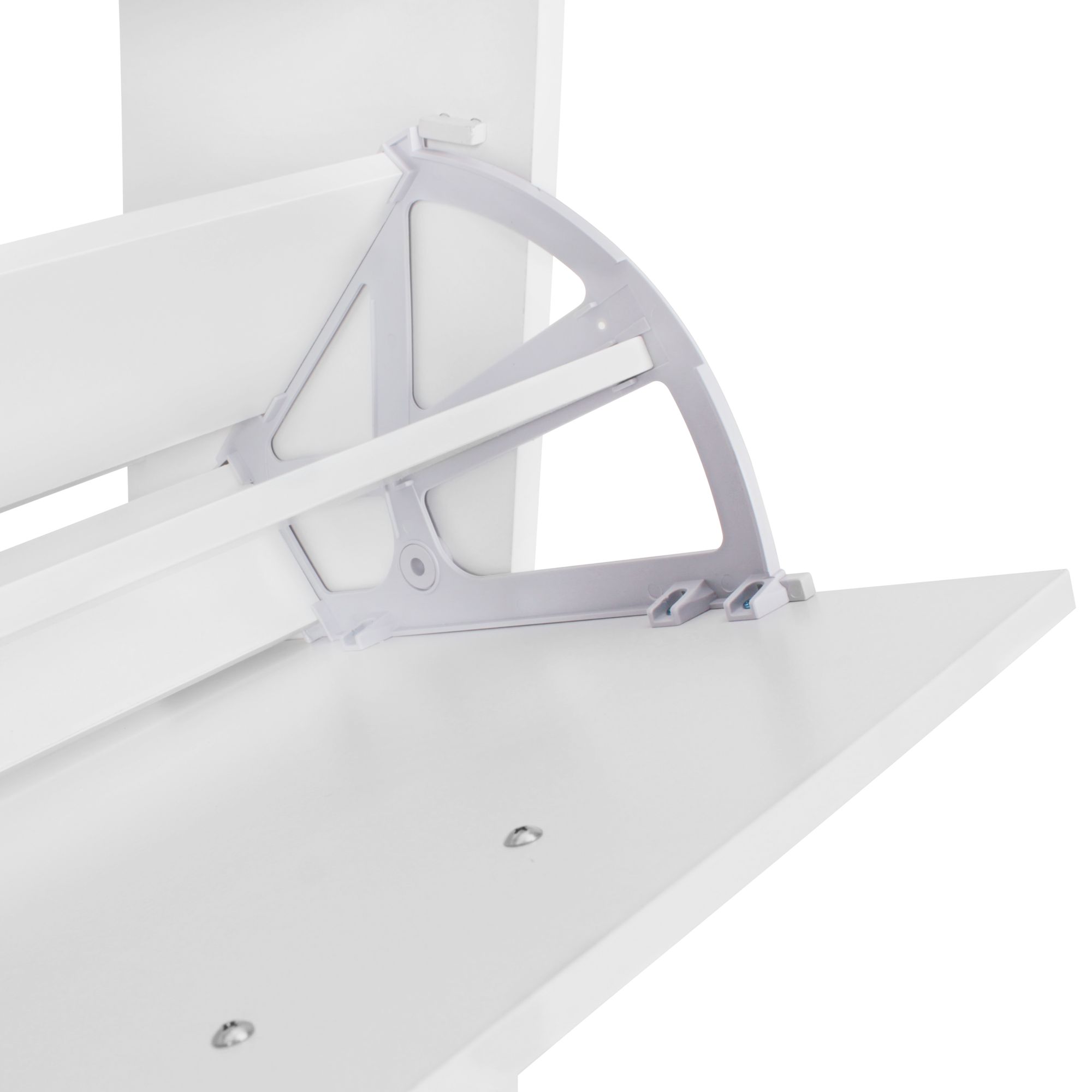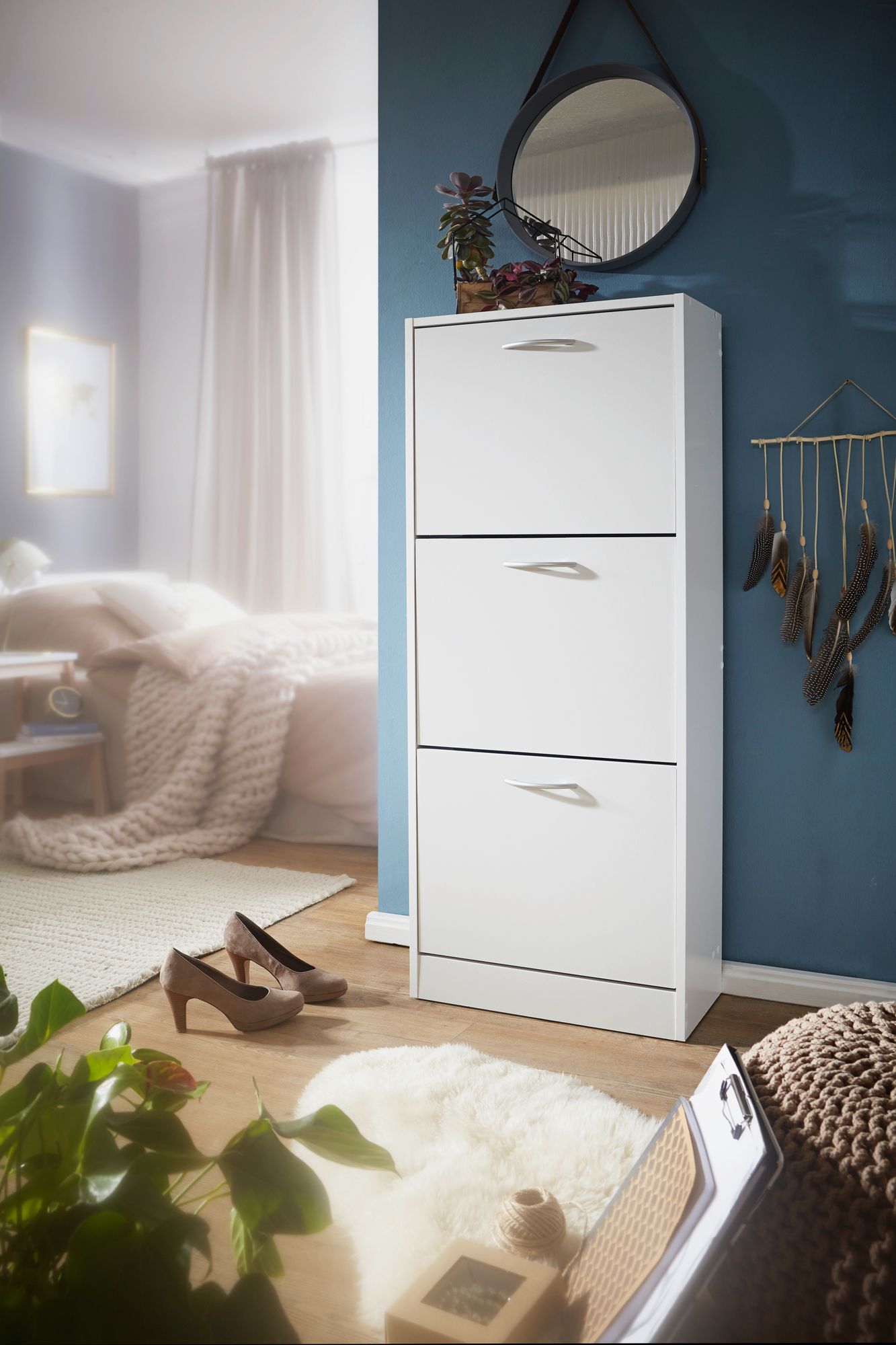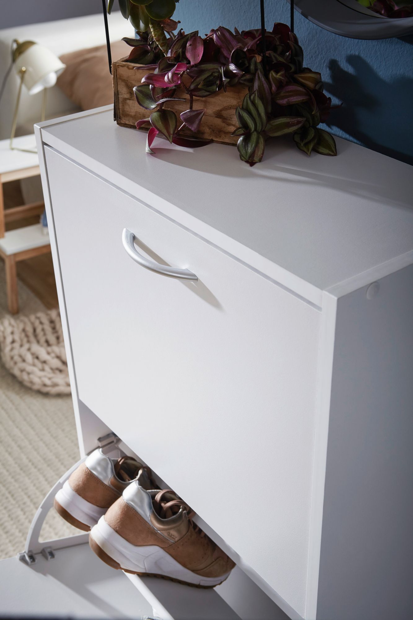 Optimice su almacenamiento con este moderno zapatero de tablero de partículas blanco. Cuenta con 3 compartimentos abatibles con asas integradas, que facilitan el acceso y permiten guardar hasta 18 pares de zapatos.