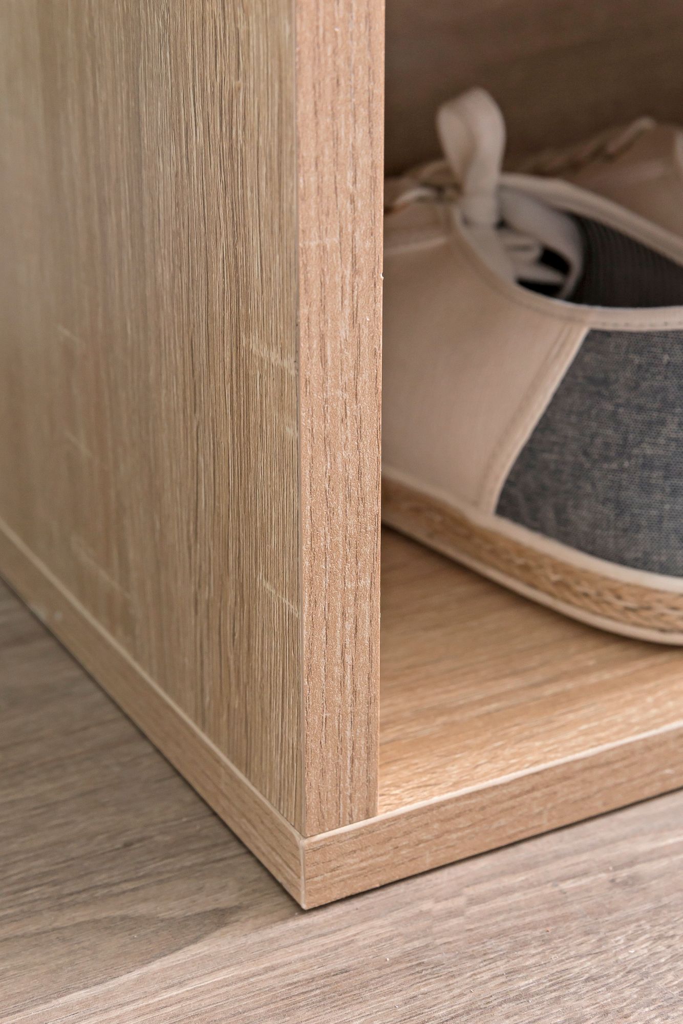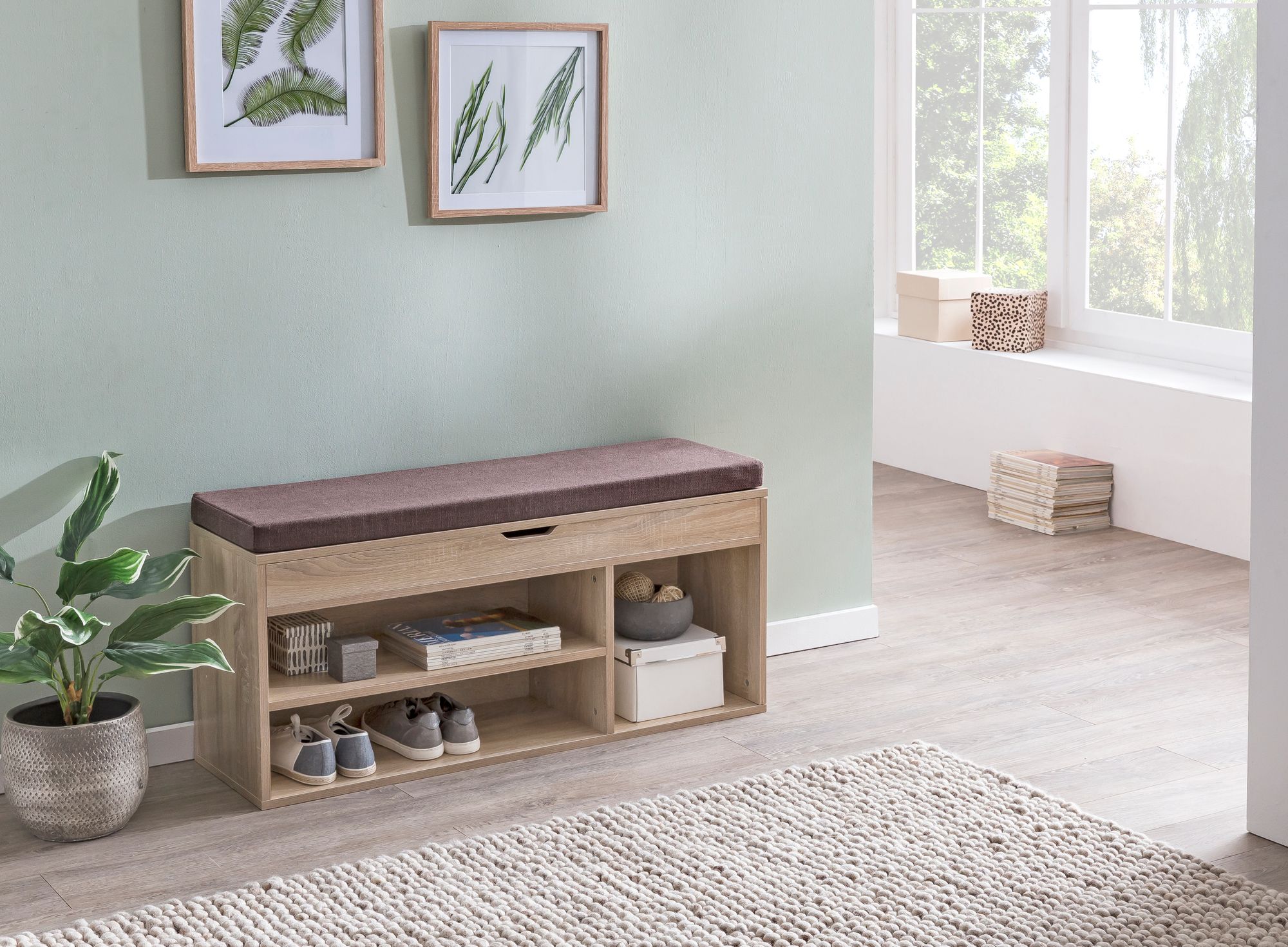 Este banco de almacenamiento Sonoma combina un diseño moderno con funcionalidad práctica. Construido con paneles revestidos de melamina en acabado madera Sonoma clara, cuenta con un asiento tapizado en tela marrón con acolchado de 5 cm para mayor comodidad. Dispone de dos niveles de almacenaje para organizar calzado y objetos en el recibidor o pasillo.