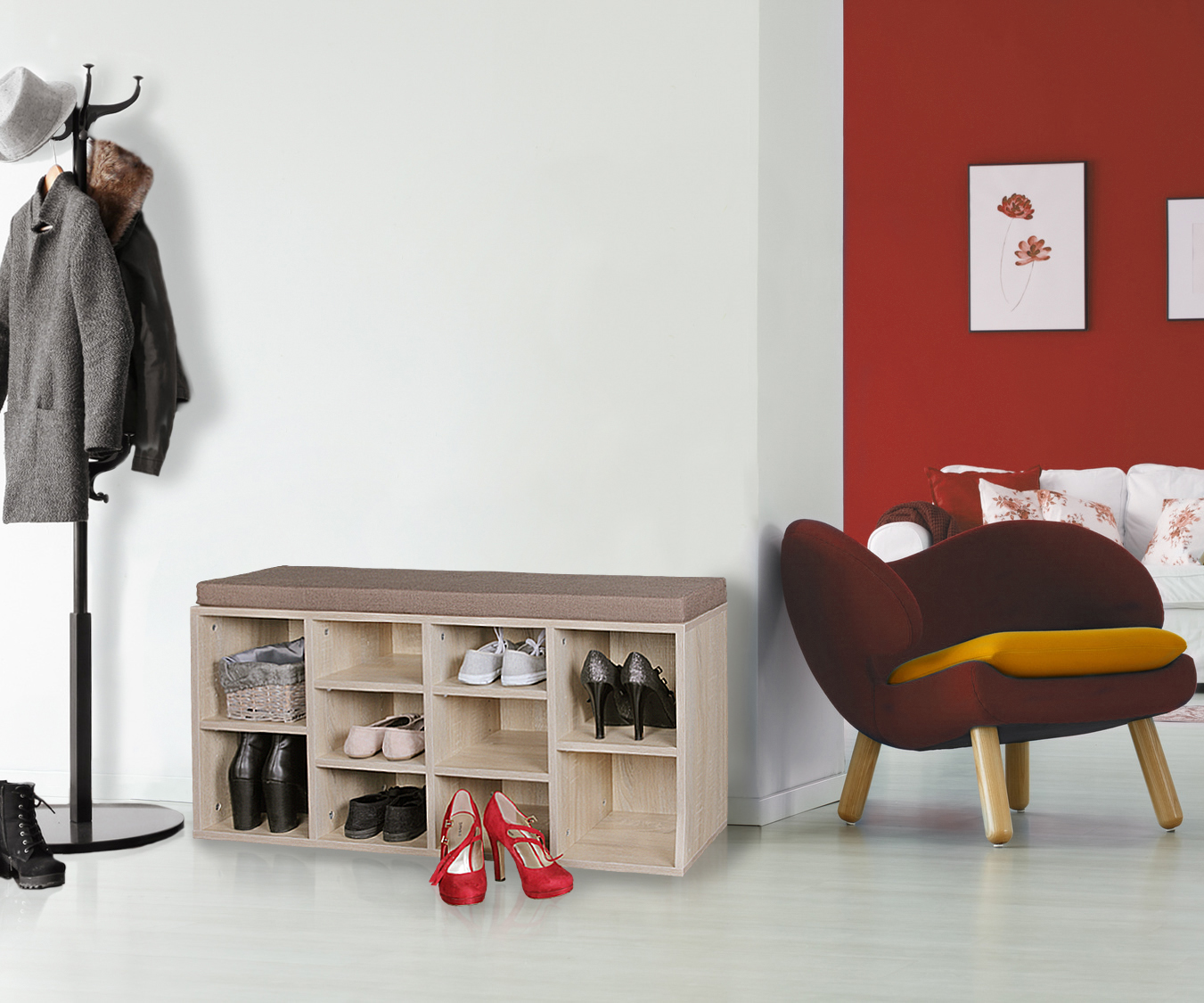 Banco para zapatos 103,5x53x30 cm | Acabado sonoma | Banco de entrada con cojín marrón