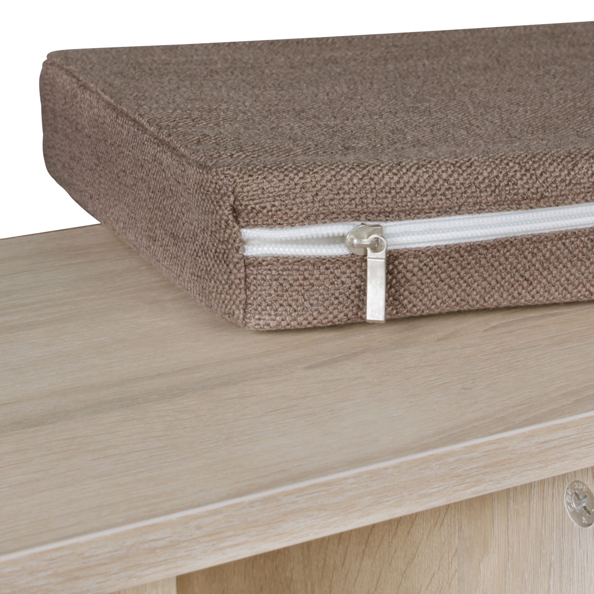 Banco para zapatos con acabado en sonoma, perfecto para el recibidor. Sus medidas compactas (103,5 x 53 x 30 cm) ahorran espacio y cuenta con un cojín marrón desmontable y lavable a 30°C para mayor comodidad.