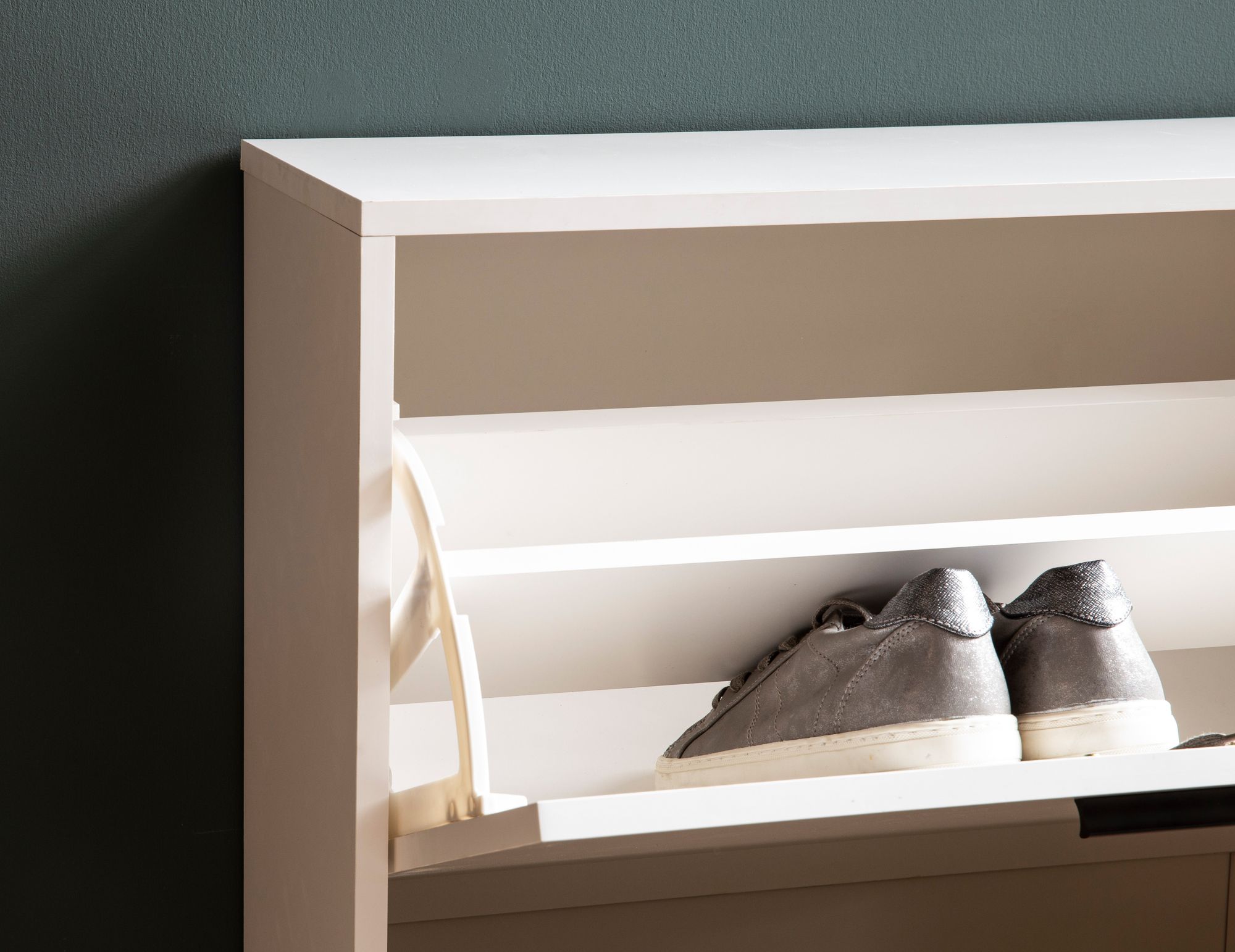 Optimice el espacio de su recibidor con este zapatero blanco confeccionado en MDF lacado con elegantes tiradores negros. Ofrece una solución práctica y compacta para el almacenamiento de calzado.