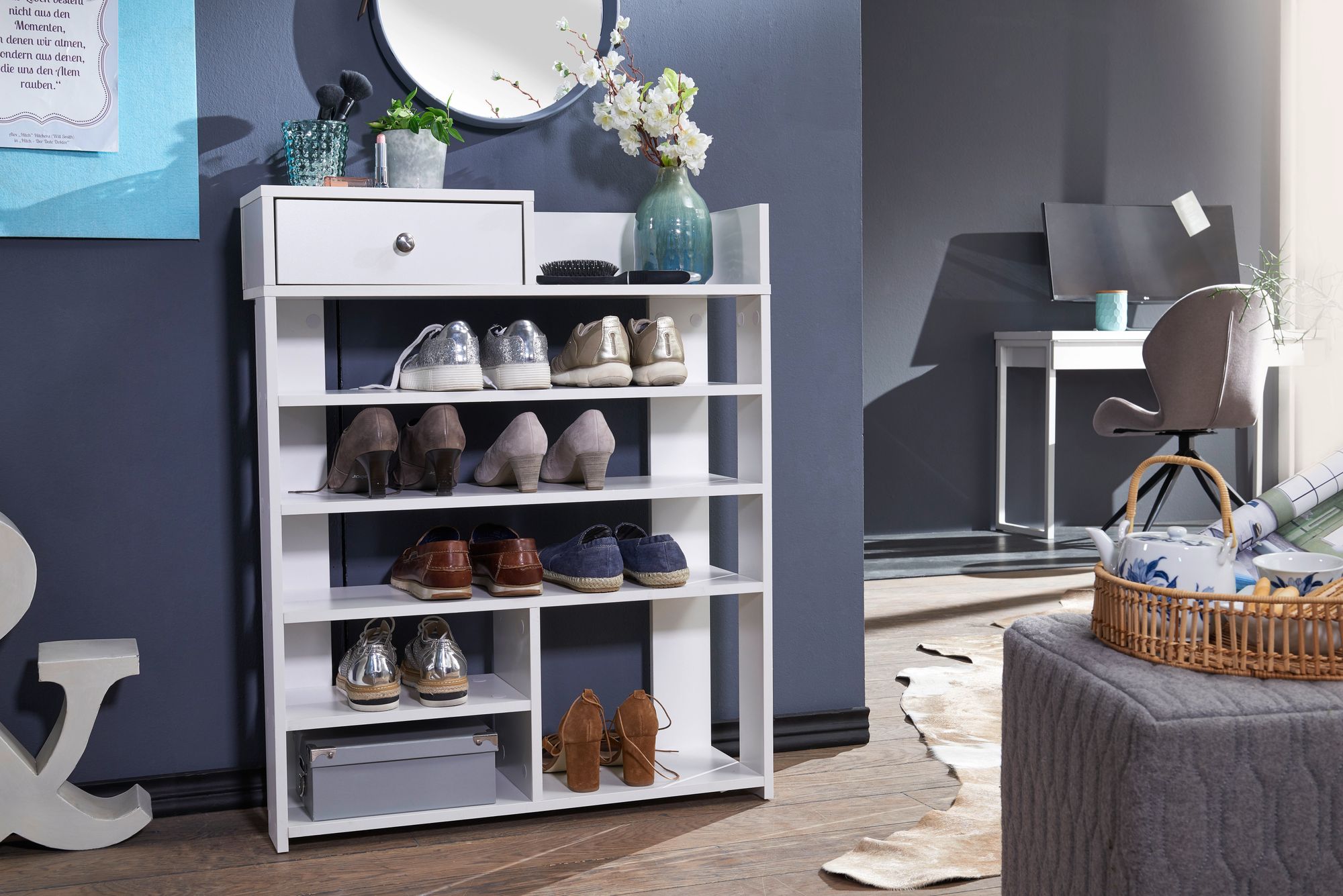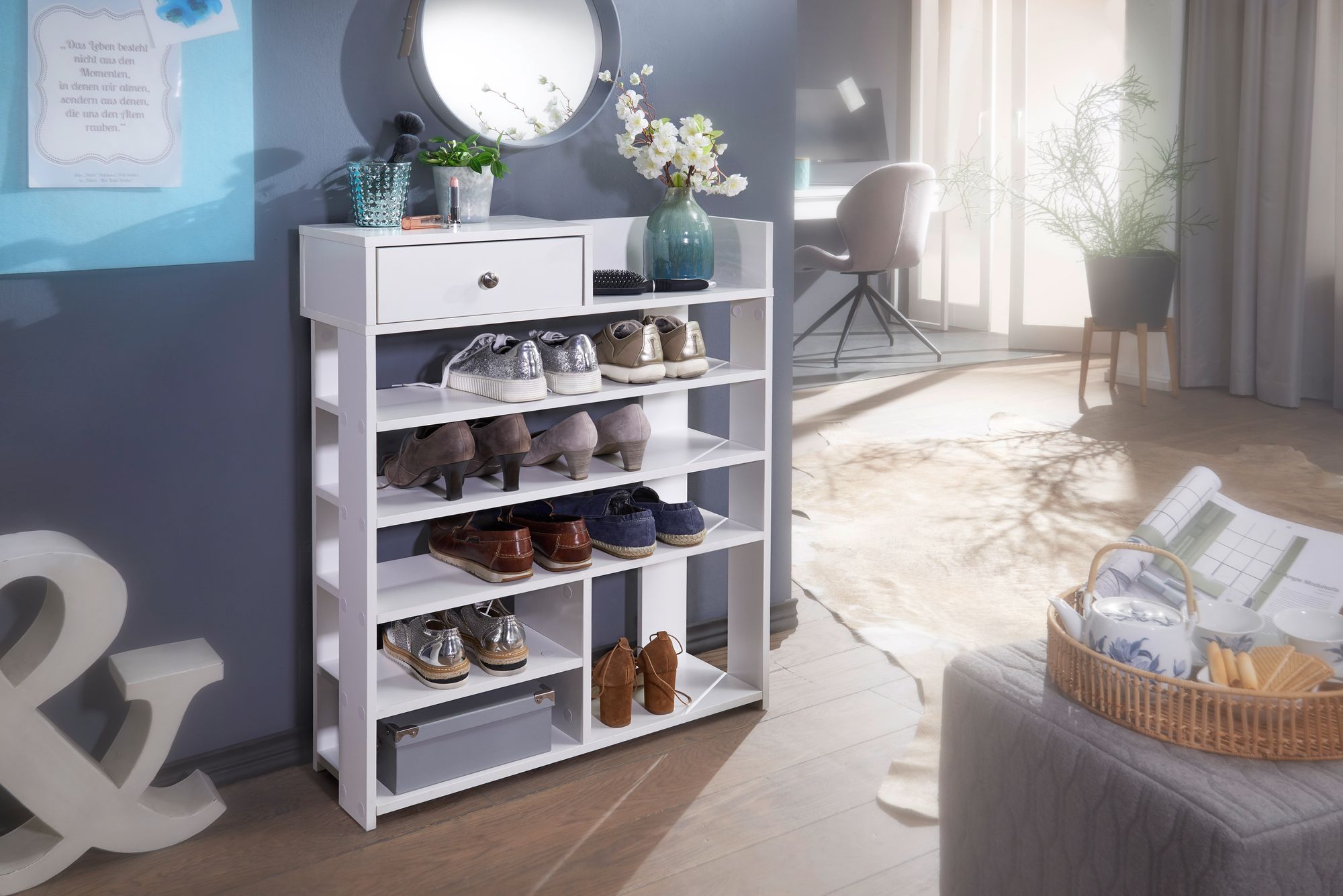Zapatero blanco de tablero aglomerado 75 x 92,5 x 24 cm | 7 compartimentos con cajón | Diseño moderno