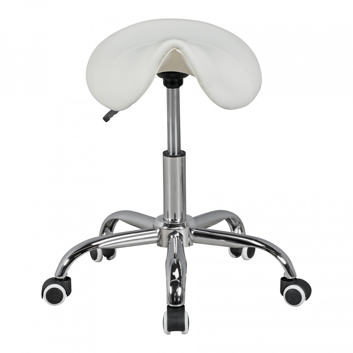 El taburete tipo silla de montar MENTON en blanco combina elegancia y comodidad con su tapizado en cuero sintético blanco y base robusta de aluminio. Perfecto para entornos profesionales que requieren movilidad.