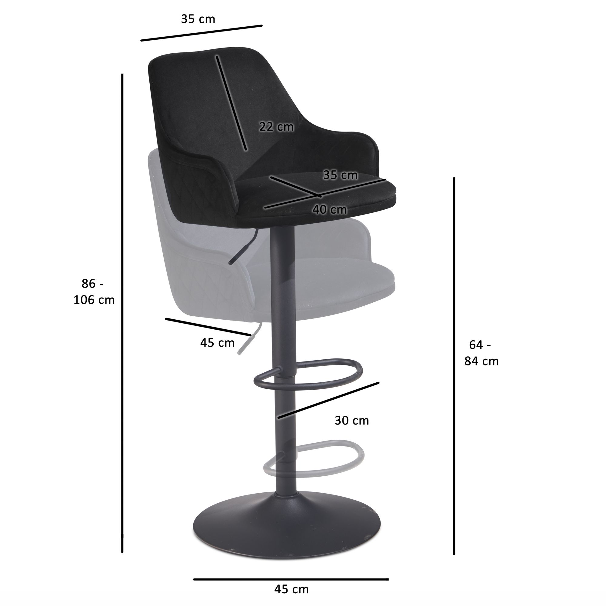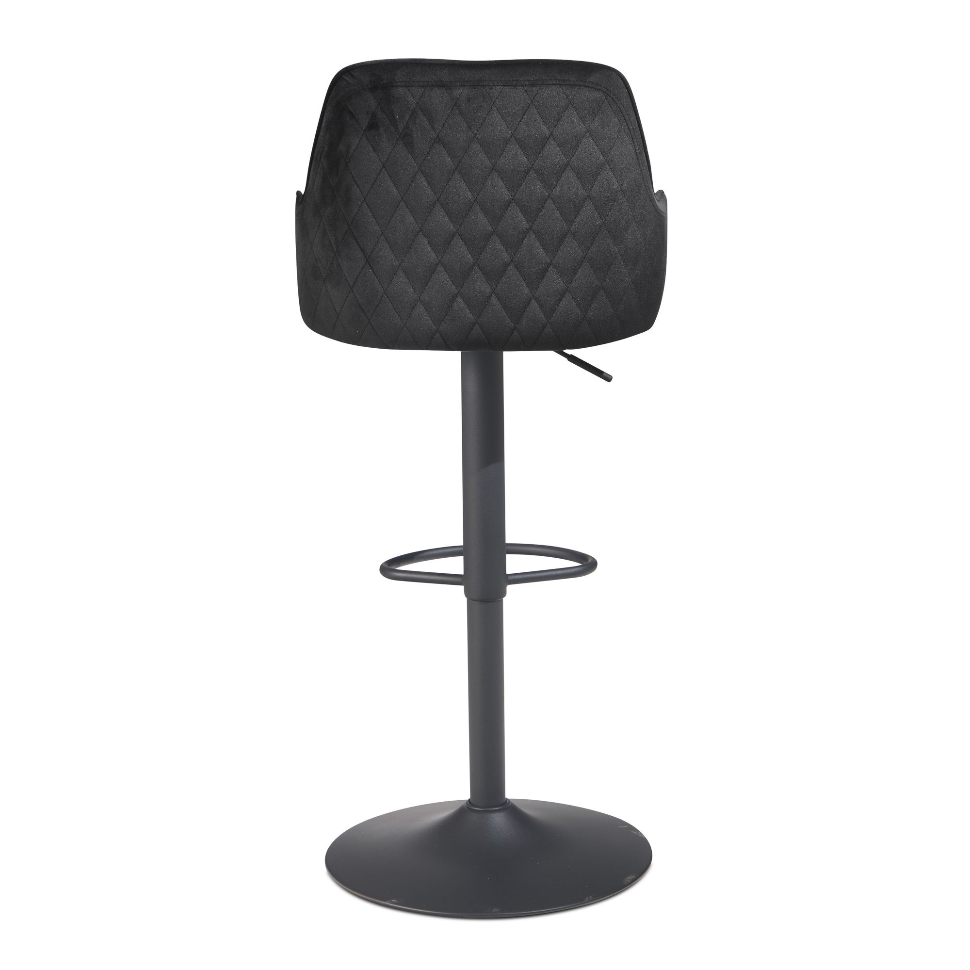 Taburete de bar moderno en terciopelo negro con altura ajustable de 86 a 106 cm. Su asiento ergonómico con costuras en forma de rombos en los reposabrazos y respaldo garantiza gran comodidad. La base metálica tipo trompeta añade estabilidad y un contraste elegante con el tejido suave.