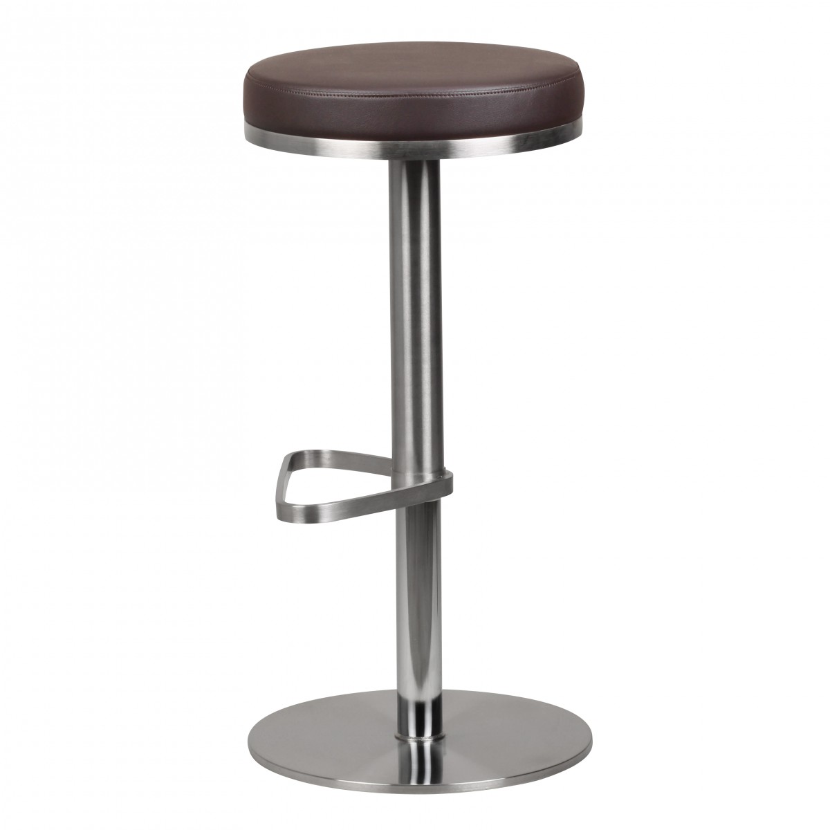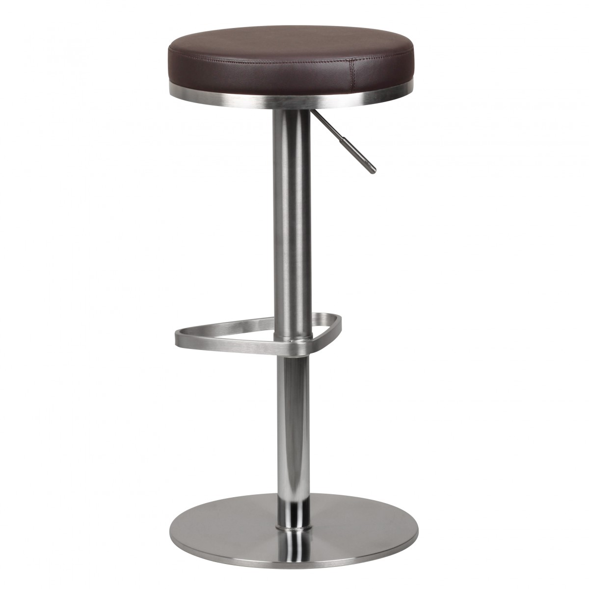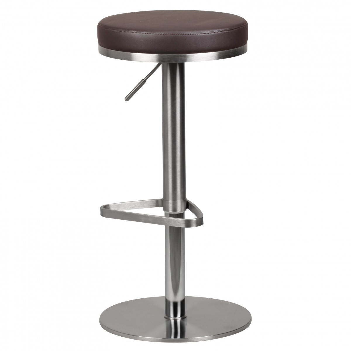 Este taburete de bar moderno cuenta con estructura cromada de acero inoxidable y asiento redondo, bien acolchado en cuero sintético marrón para mayor comodidad. La altura es ajustable entre 57 y 82 cm para un ajuste preciso según su talla y espacio.