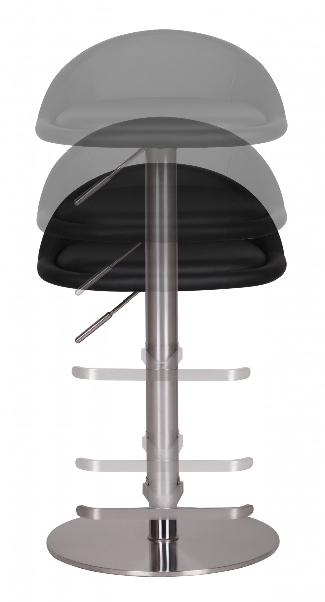 Taburete de bar moderno en acero inoxidable con asiento en piel sintética negra, que ofrece confort óptimo con altura ajustable de 54 a 79 cm.