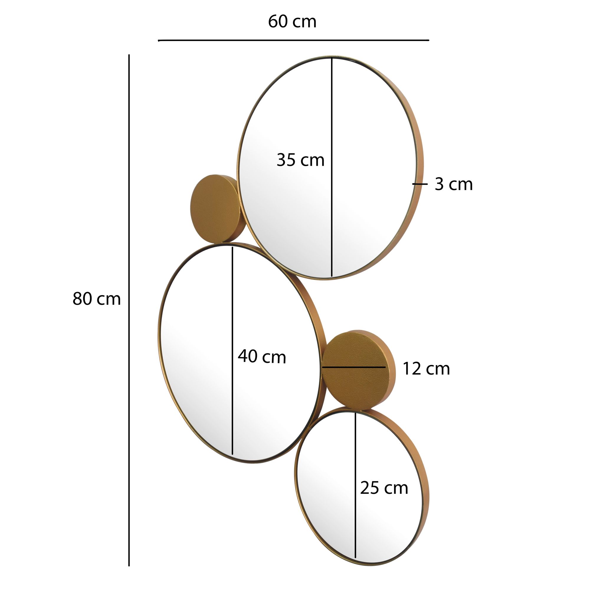 Espejo de pared metálico dorado | 80x60 cm | Tres espejos redondos con círculos decorativos