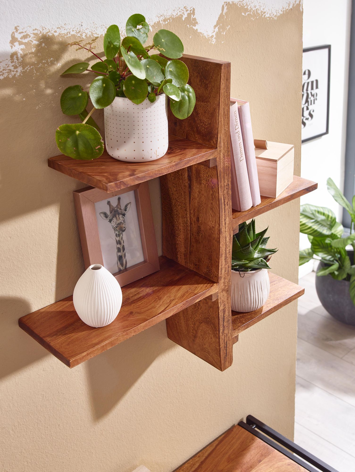 Con cuatro superficies de almacenamiento, es ideal para exhibir fotos, libros o elementos decorativos, optimizando el espacio mural. Cada estantería es hecha a mano, con vetas y tonalidades únicas.
