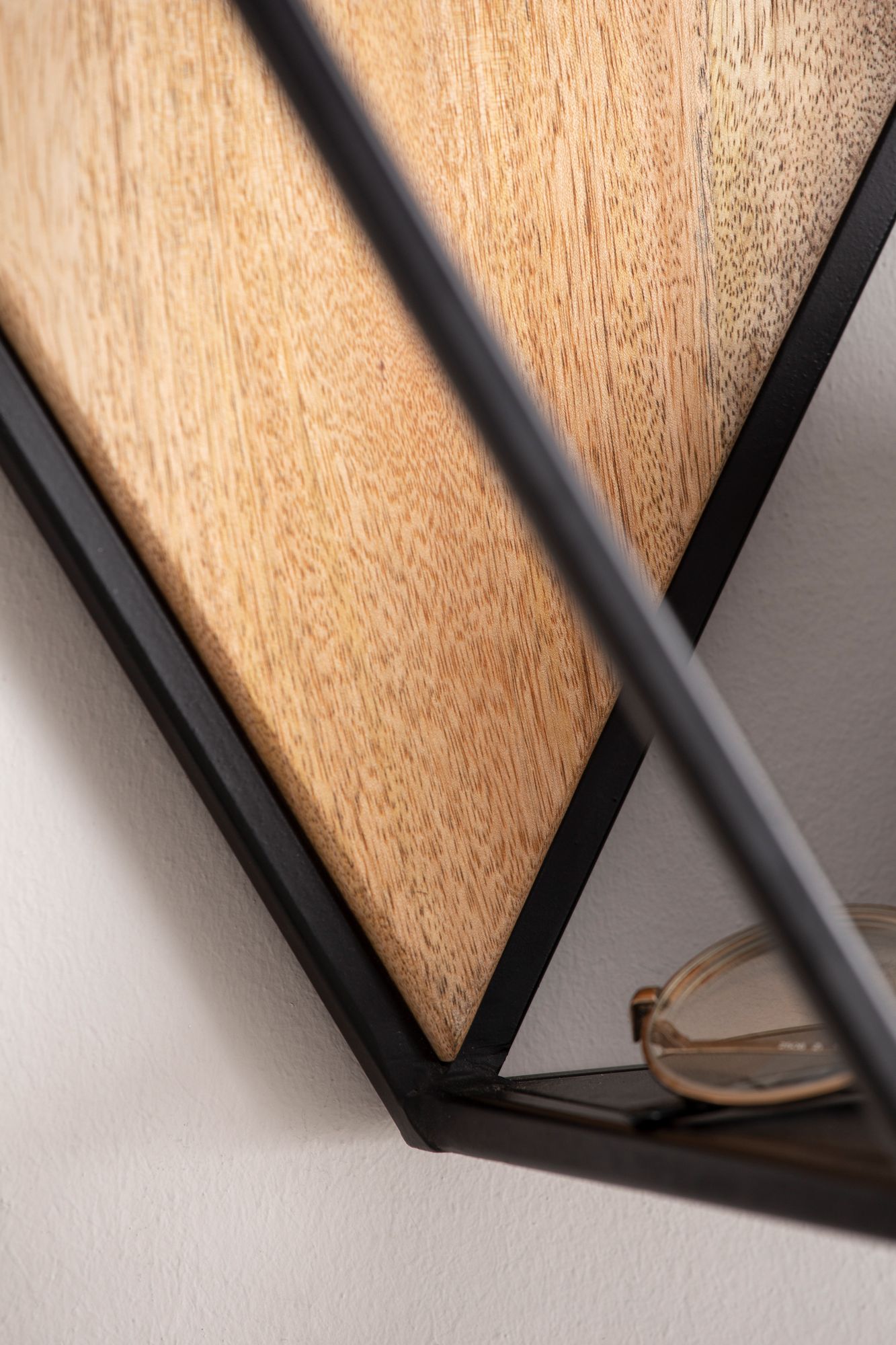 Esta estantería hexagonal combina durabilidad y estilo con madera maciza de mango y un marco de metal negro con recubrimiento en polvo. Cuenta con tres estantes negros fijos y un respaldo marrón claro, ideales para mostrar decoración o plantas pequeñas.