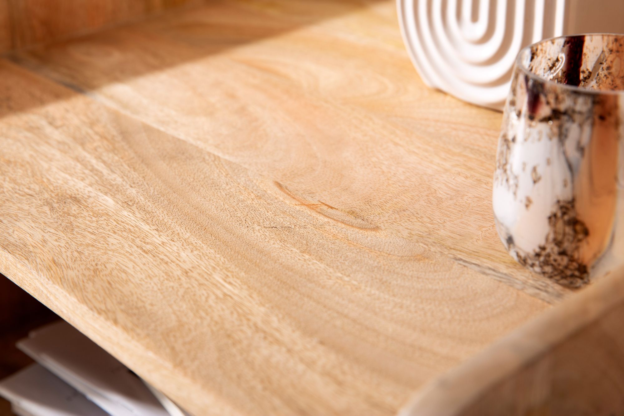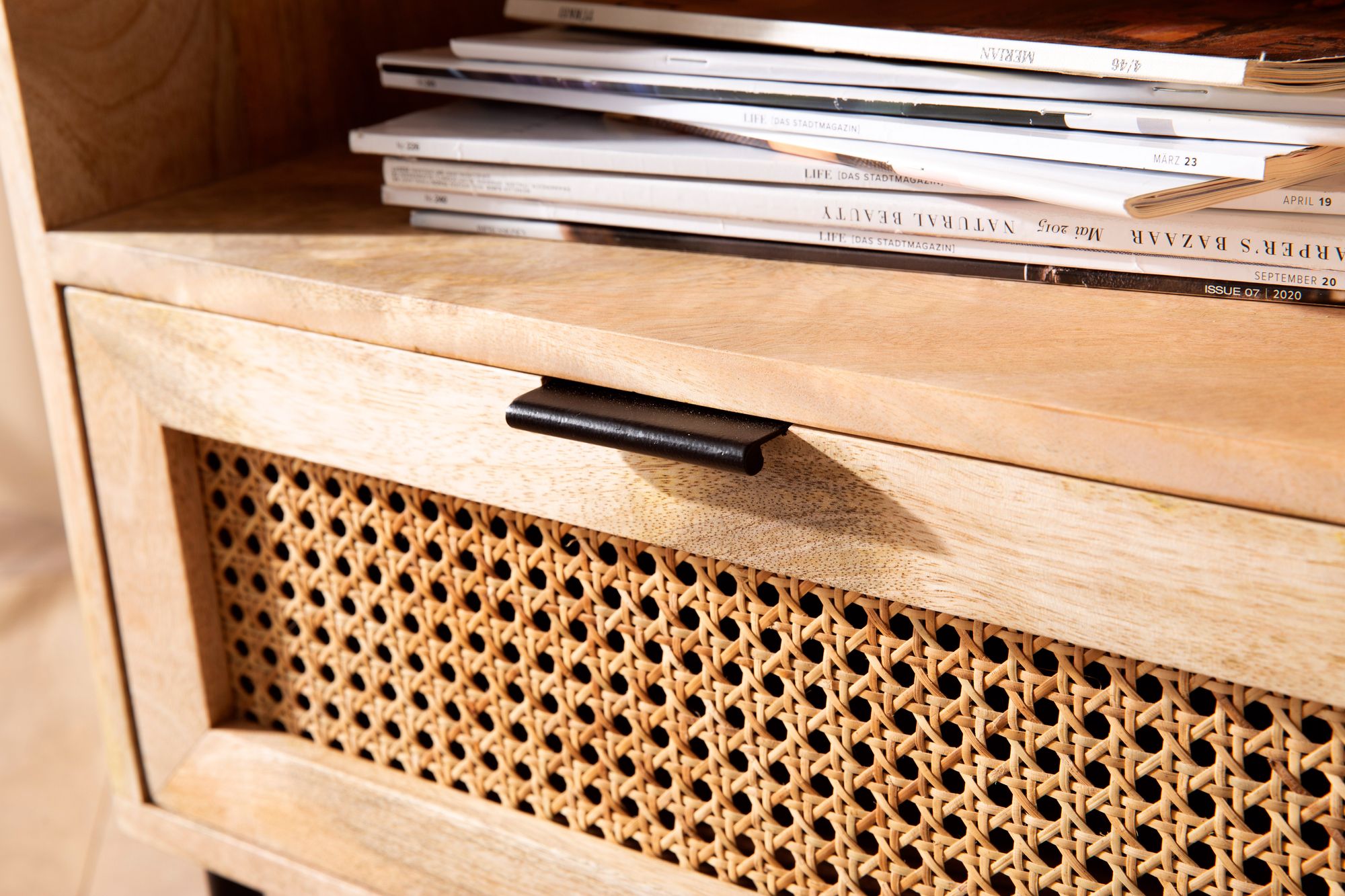 - Materiales: cuerpo de madera maciza de mango (barniz transparente), frente de cajón de ratán y MDF, patas y tirador metálicos con pintura en polvo