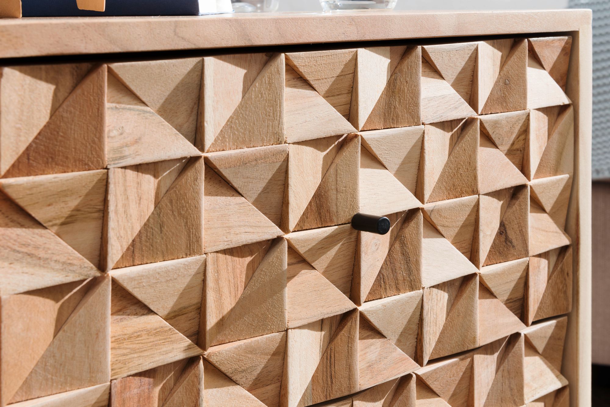 El acabado artesanal resalta la veta natural de la madera, complementado por tiradores metálicos negros que enfatizan su estilo.