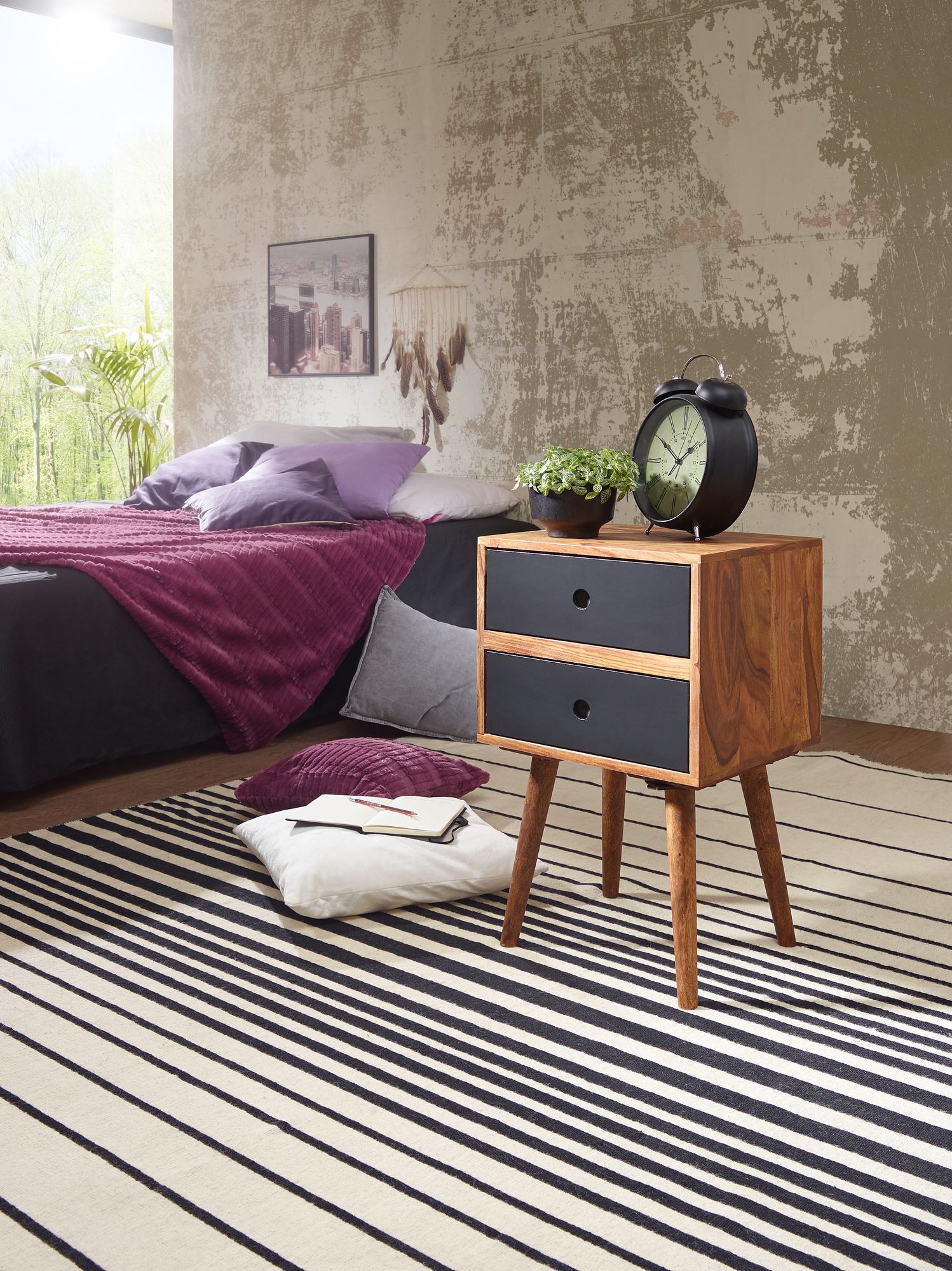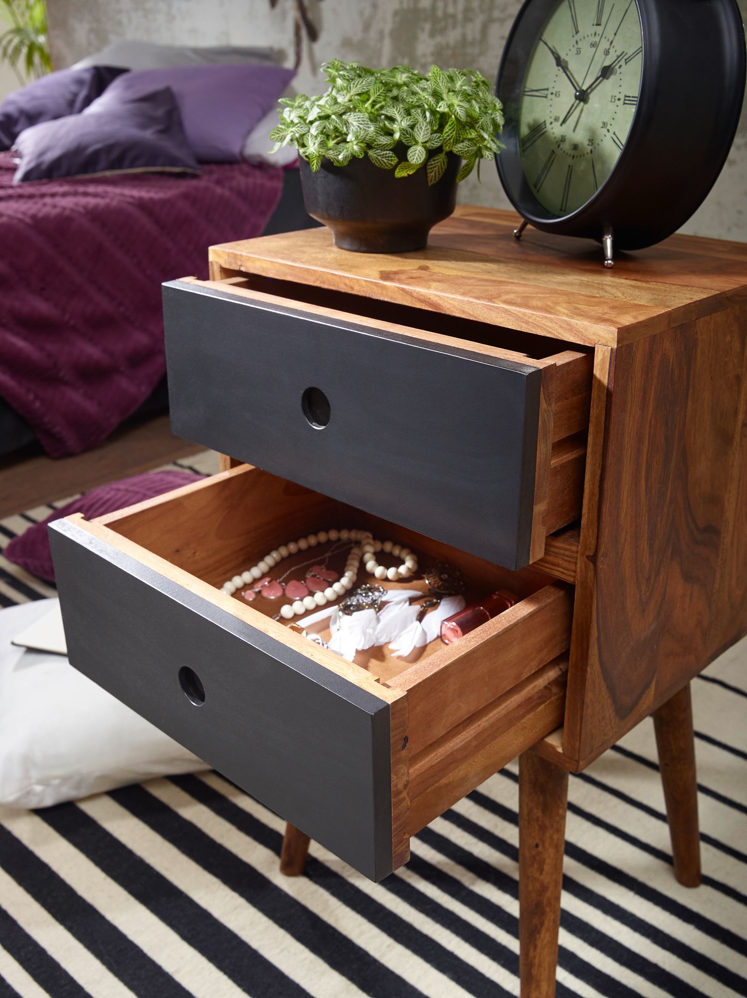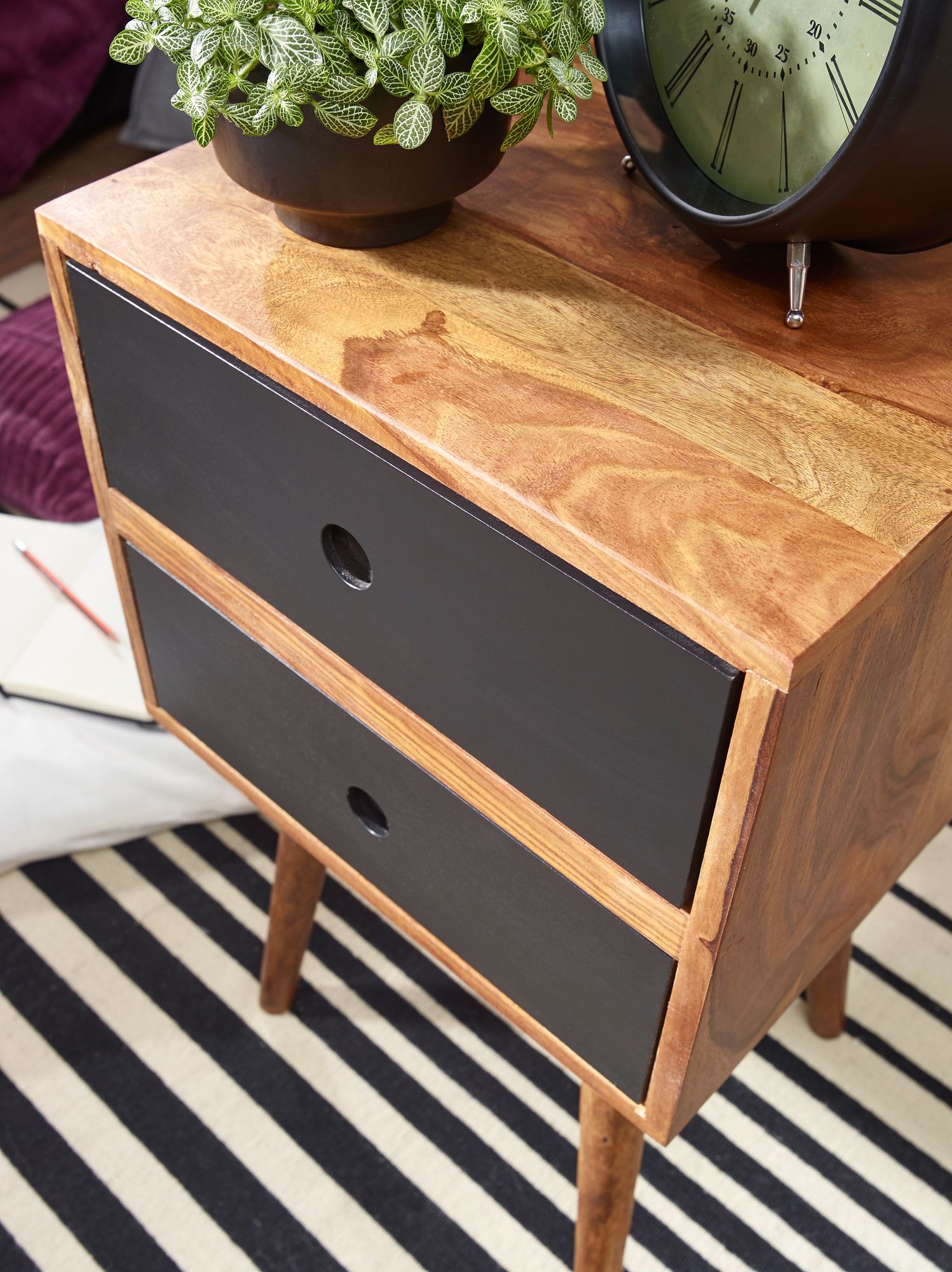 Información sobre el producto "Retro cabecera repa / sheesham mesita de noche de madera con 2 cajones de color marrón oscuro / negro"