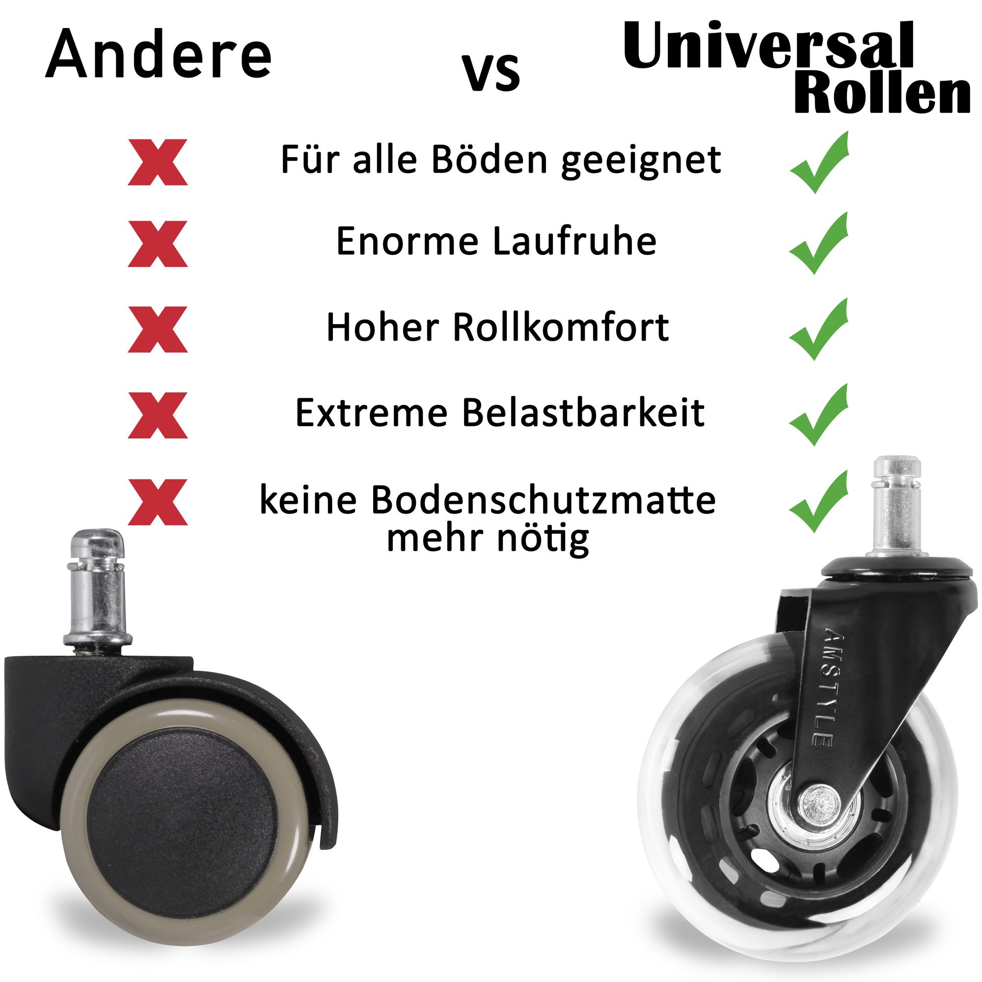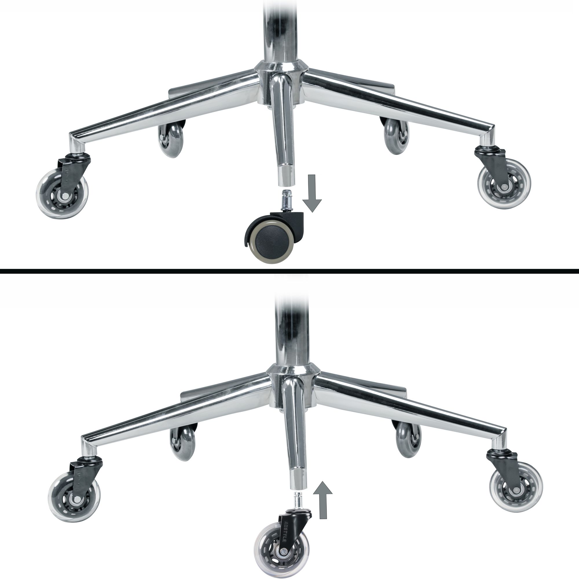 Información sobre el producto "Set de 5 ruedas universales silenciosas para silla de oficina | Transparente / Negra | Diámetro 75 mm, Pasador 11 mm"