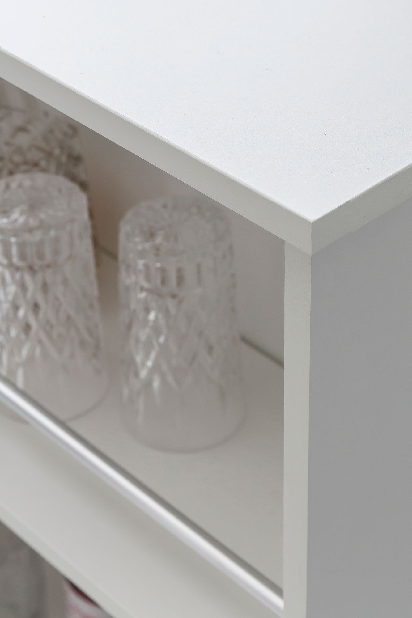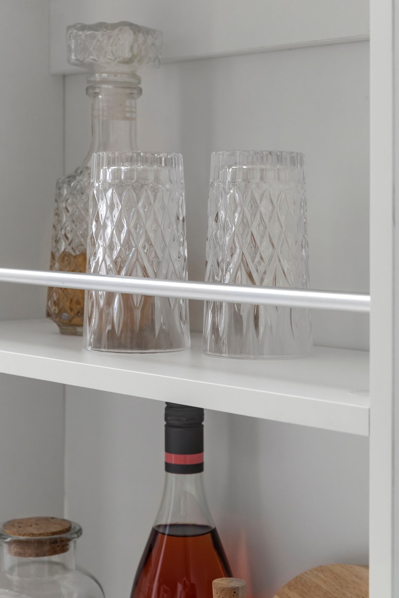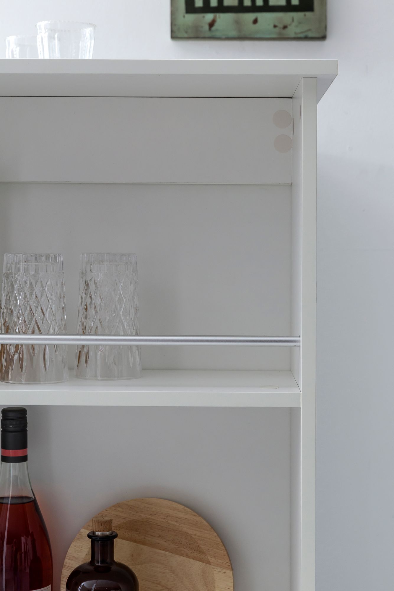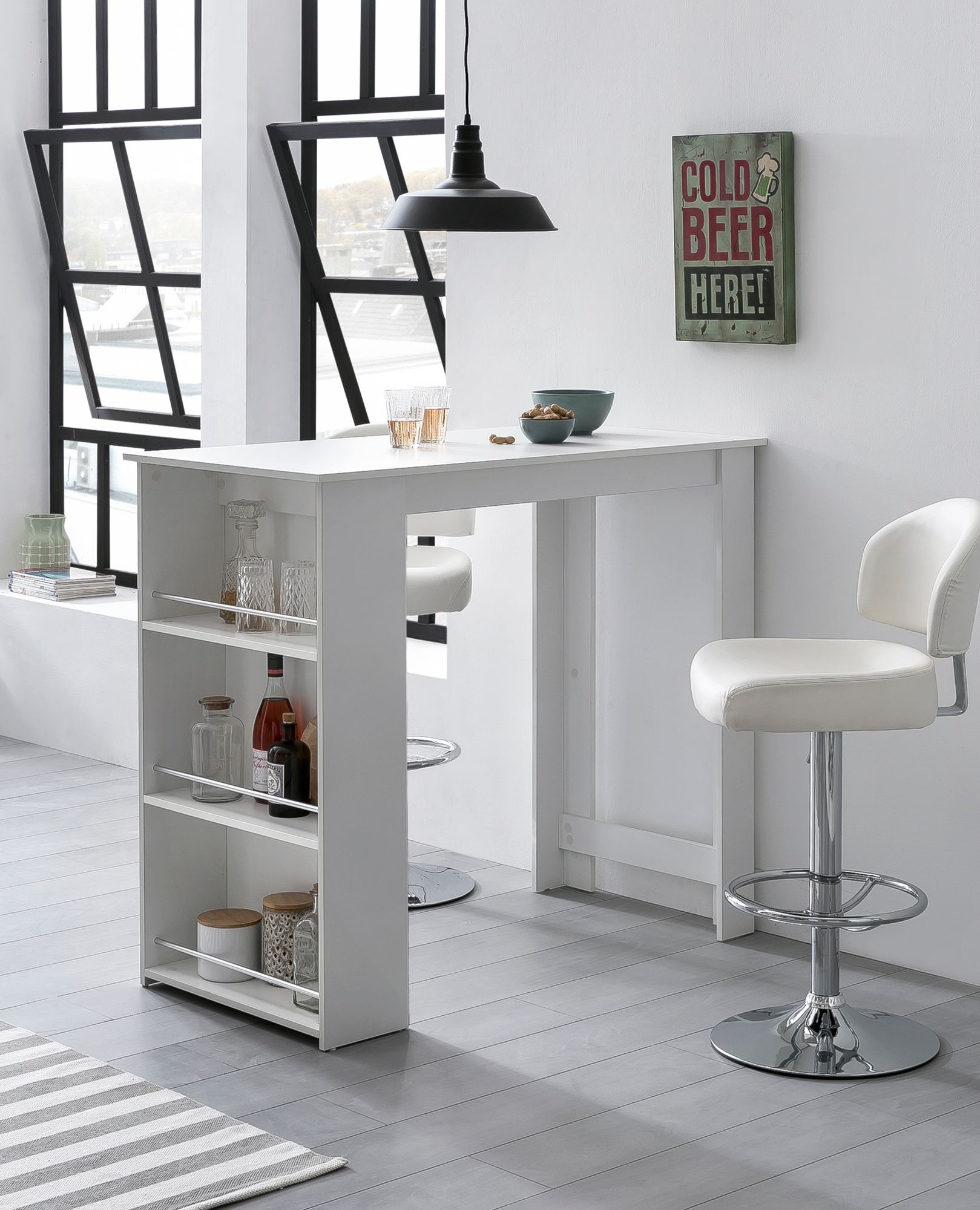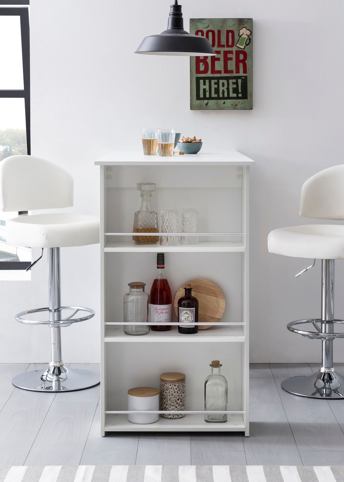 Esta mesa de bar blanca presenta un diseño moderno y estilizado con una amplia superficie y tres estantes integrados ideales para botellas de vino, vasos y utensilios de cocina. Las barras de aluminio plateadas evitan que los objetos caigan.