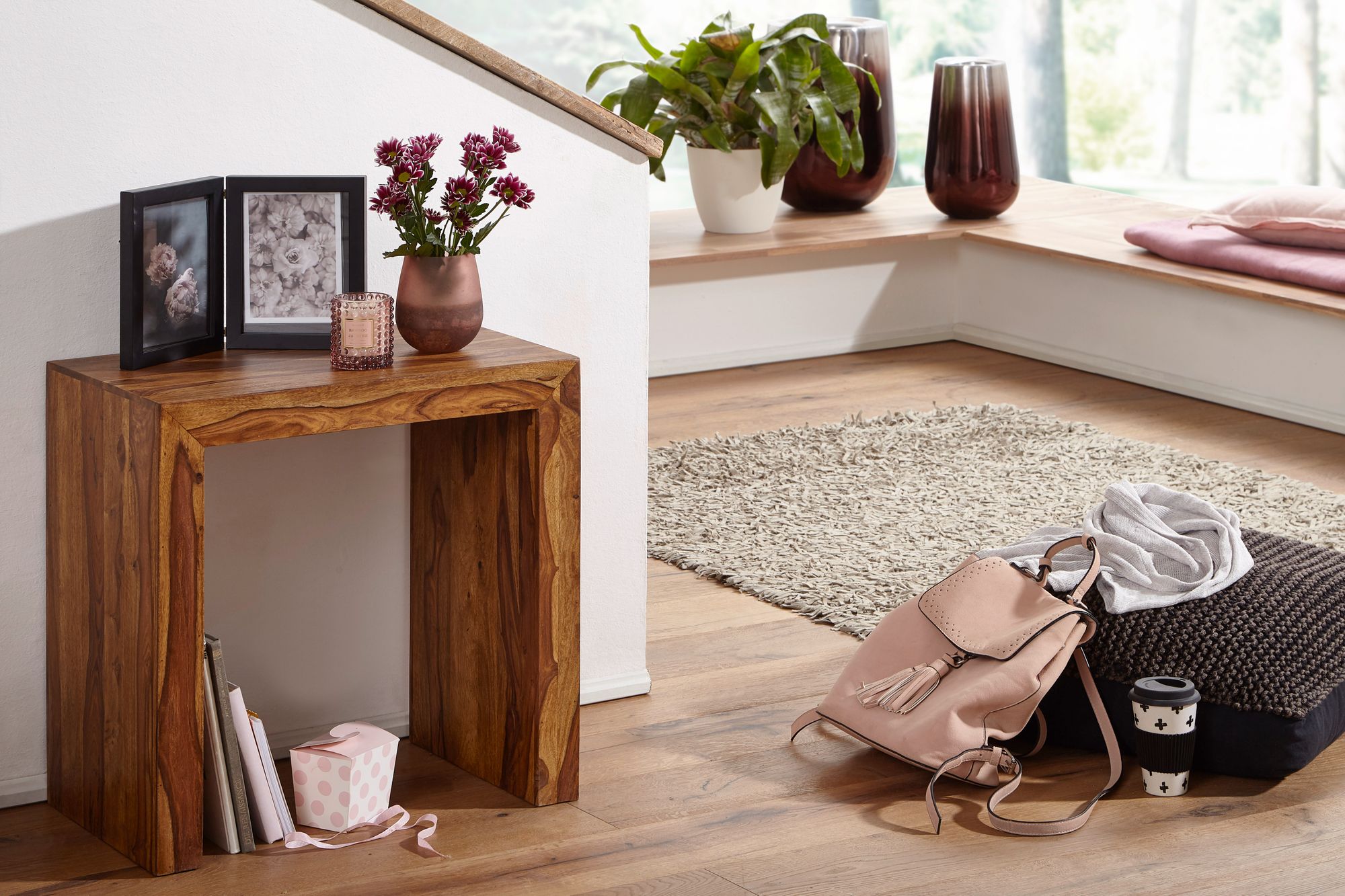 La mesa auxiliar MUMBAI está fabricada en madera maciza de Sheesham con un diseño clásico y color marrón oscuro, ofreciendo una pieza funcional y elegante. Sus medidas compactas permiten colocarla fácilmente en esquinas o como superficie adicional en la sala de estar.