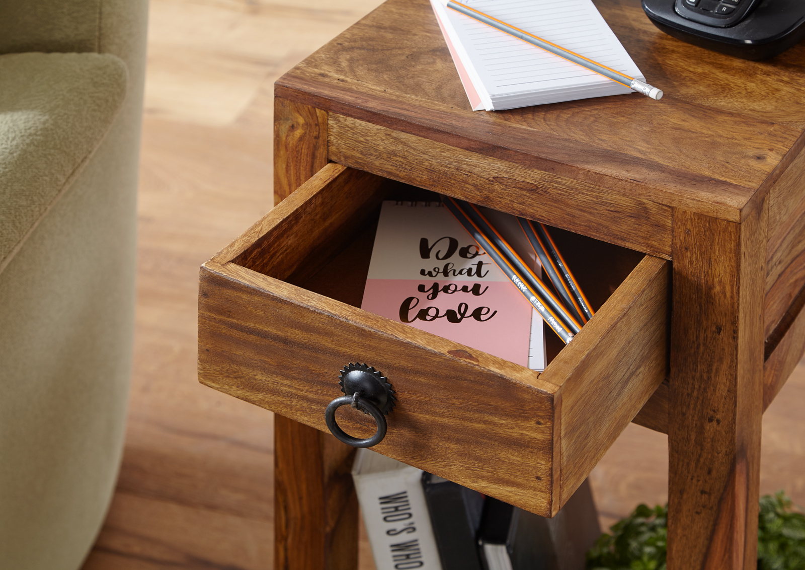 Mesa auxiliar MUMBAI madera maciza Sheesham marrón natural con cajón | 30x30x68 cm | Estilo rústico