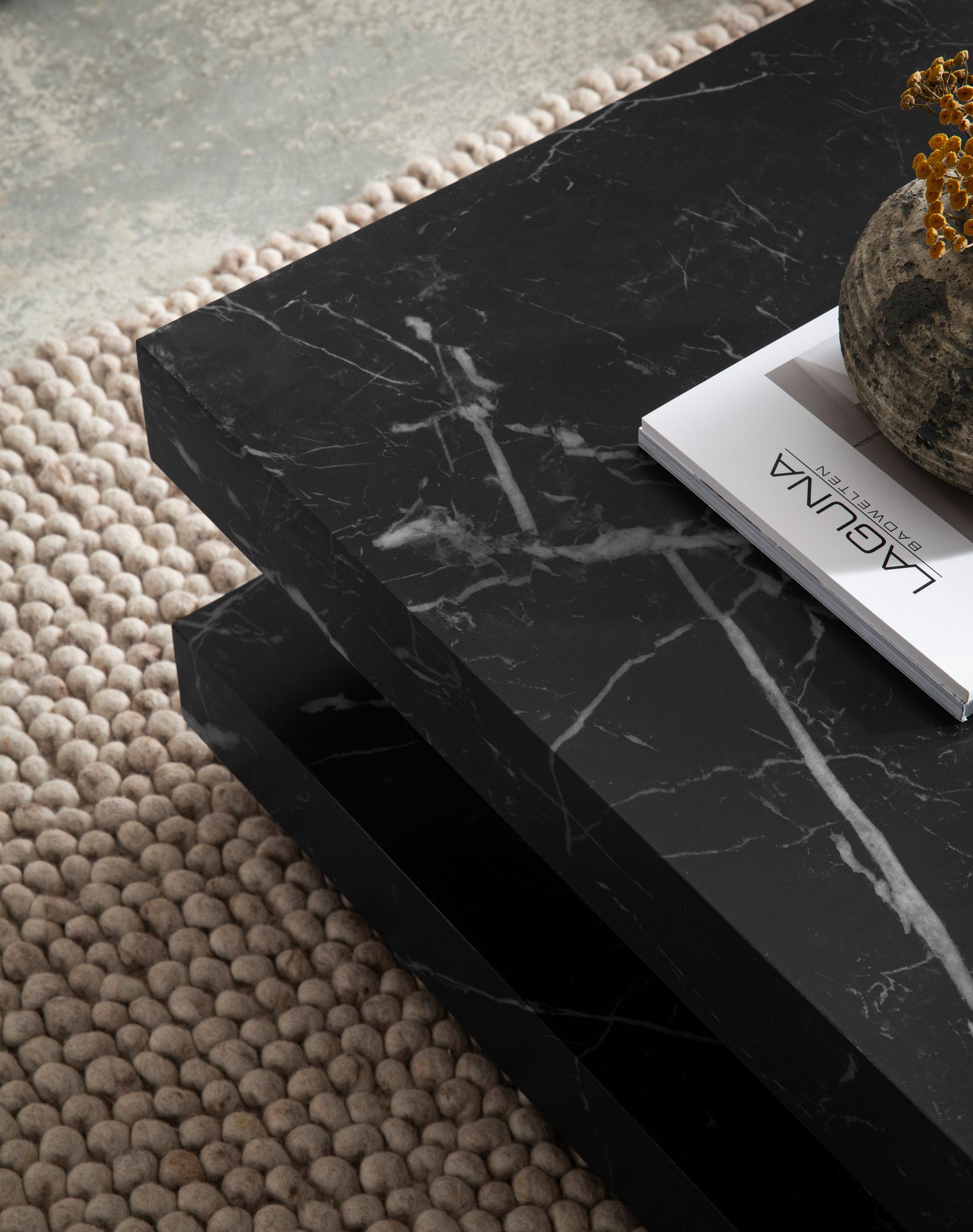 Mesa de centro cuadrada moderna con acabado mate efecto mármol negro en MDF foliado con capa de barniz transparente. Ideal para interiores elegantes, ofrece una superficie práctica y almacenamiento adicional debajo.