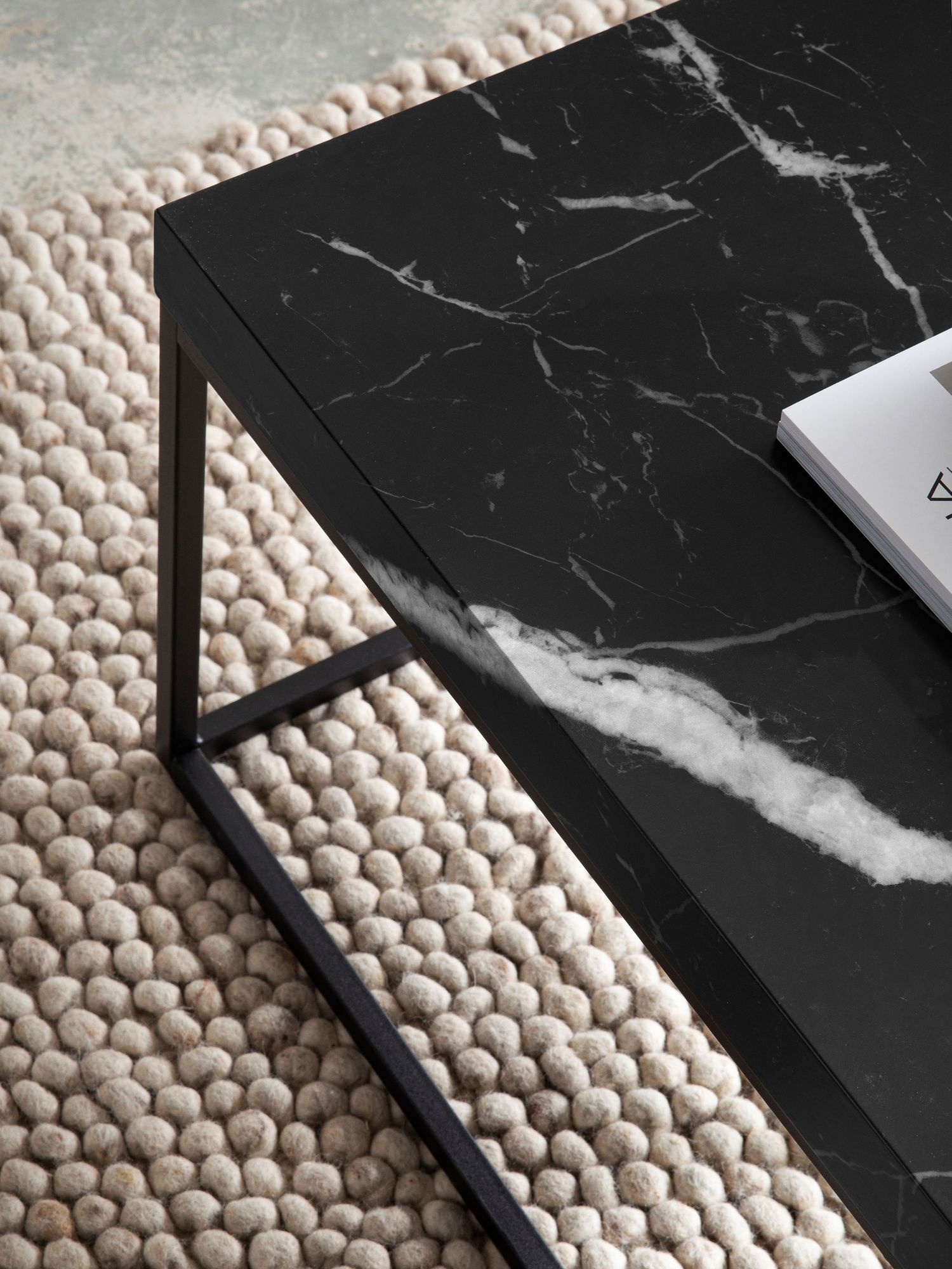 Información sobre el producto "Mesa de centro laminada MDF negro efecto mármol | Patas metálicas negras | 120x60x38 cm"