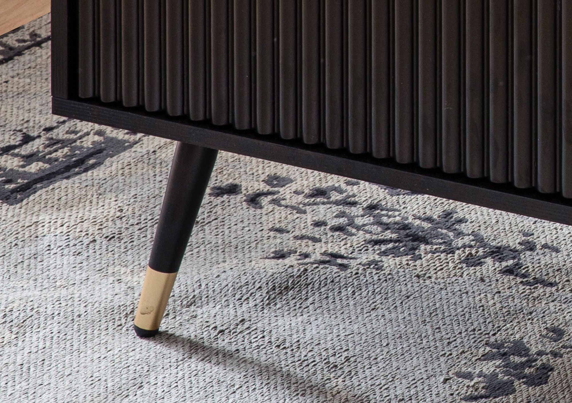 - Materiales: tablero laminado con aspecto roble negro, patas y tiradores de metal pintado