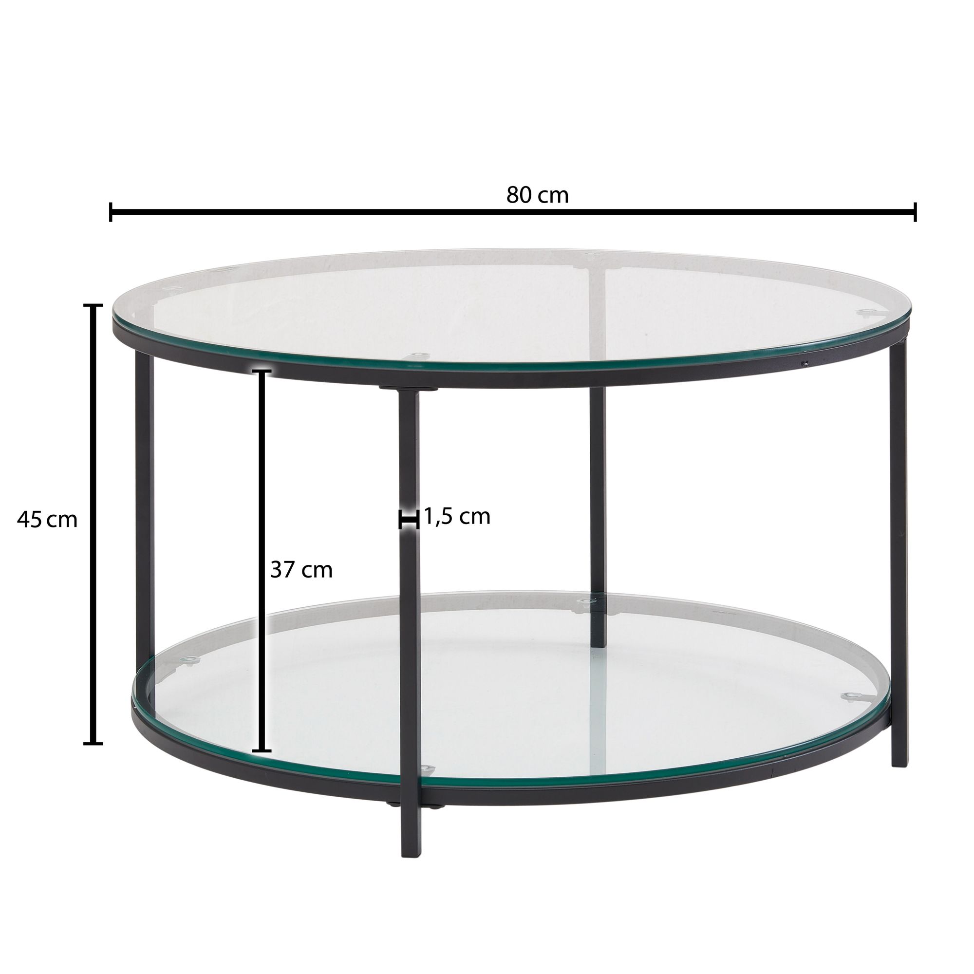 Descubra esta elegante y funcional mesa de centro redonda con estructura metálica negra y dos superficies de vidrio transparente. Su diseño moderno se integra fácilmente en cualquier salón.